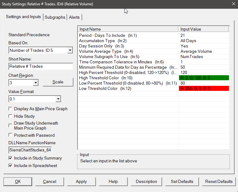 The problem is the fact that you have the Relative Volume set as the Main Price Graph. As such, the Number of Trades is not correct, as it is not the number of trades from the underlying data, it is a single trade for each volume. You can see this if you display the Number of Trades study. If you really want to get rid of the symbol data and have another item replace it, then you have to make sure that other studies that reference the Main Price Graph are set to find their data from somewhere else. The easiest way to do this would be to keep the Main Price Graph, but if you really want to get rid of it, then you will want to add a "Add Additional Symbol" study for that same symbol, then hide that study and then base the other studies on it. A problem with the "Add Additional Symbol" is that it does not have data for a Continuous Contract, in which case you may want to setup a separate chart and use the "Study/Price Overlay" and then base the studies on that overlay. For the most reliable, advanced, and zero cost futures order routing, use the Teton service: Sierra Chart Teton Futures Order Routing |