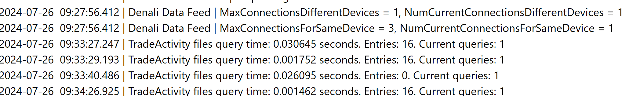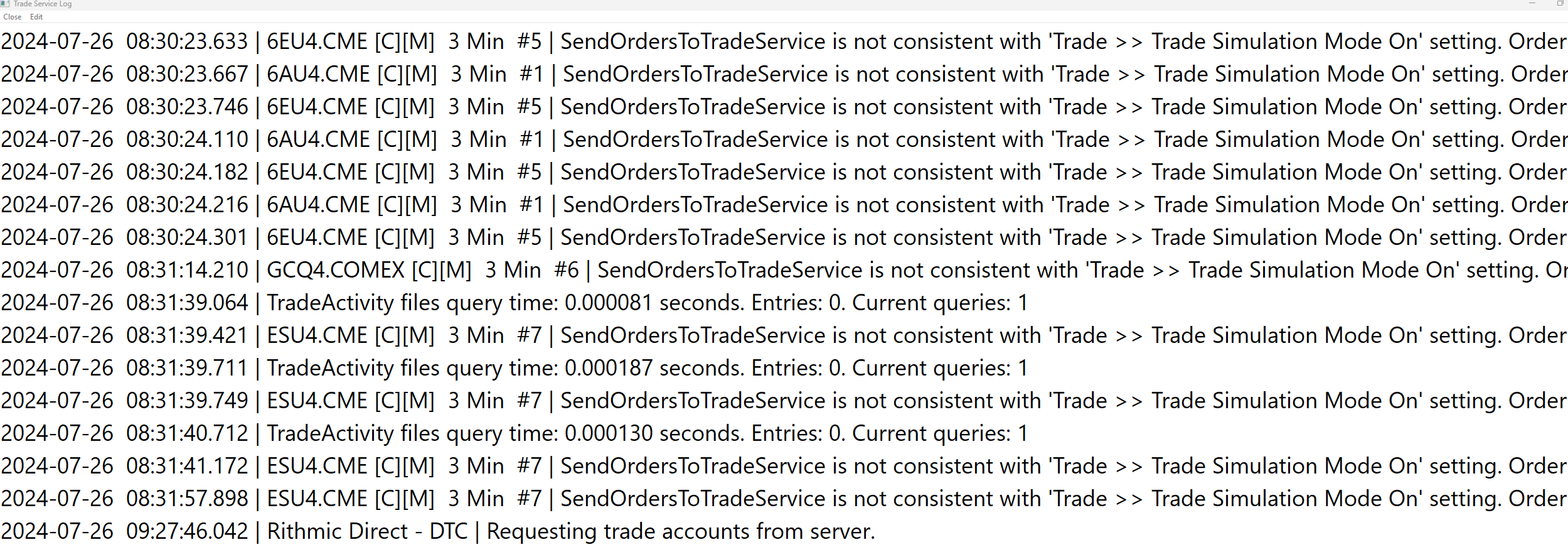 Hi, My system generated several orders at different periods today and those orders were not sent. The first set of orders(i.e. which can be seen via the second attached screenshot of alerts) was not sent apparently due to being in SimulationMode per the Trade Service Log. The issue is that I wasn't in Simulation Mode. The second set of orders were just not sent. There was a message in the Trade Service Log that mentioned MaxConnections but I only have a single connection/instance running. Orders have been sent systematically both in a live and sim environment in the past. Can someone advise as to why this is happening? Thanks. Date Time Of Last Edit: 2024-07-26 13:45:51