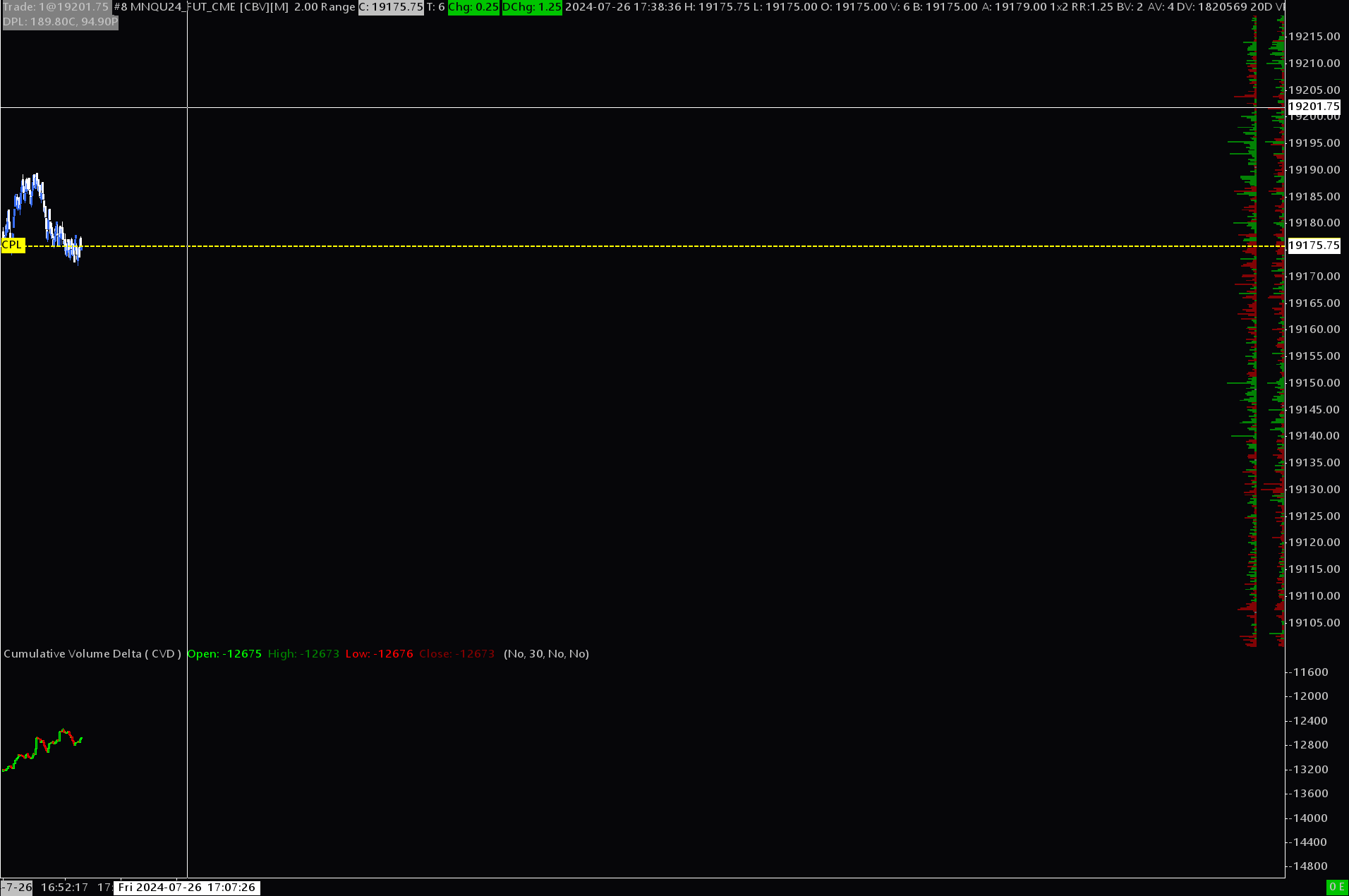 See attached images ( via links ). I have an NQ range chart with a 1 day and a 20 day Volume by price study on the right. They are setup to show delta ( and NOT your typical volume profile ). But, when I move the chart, the size of the delta bars changes as I move the chart. Not that when my chart / candlesticks are on screen and toward the right, then the delta bars are full size ( something like 30% of window ), but as I move the candles to the left, the bars shrink which makes comparing the size to each other more difficult. Please help. https://www.sierrachart.com/image.php?Image=1722120789104.png https://www.sierrachart.com/image.php?Image=172212085020.png https://www.sierrachart.com/image.php?Image=1722120877525.png Thanks, Anthony |