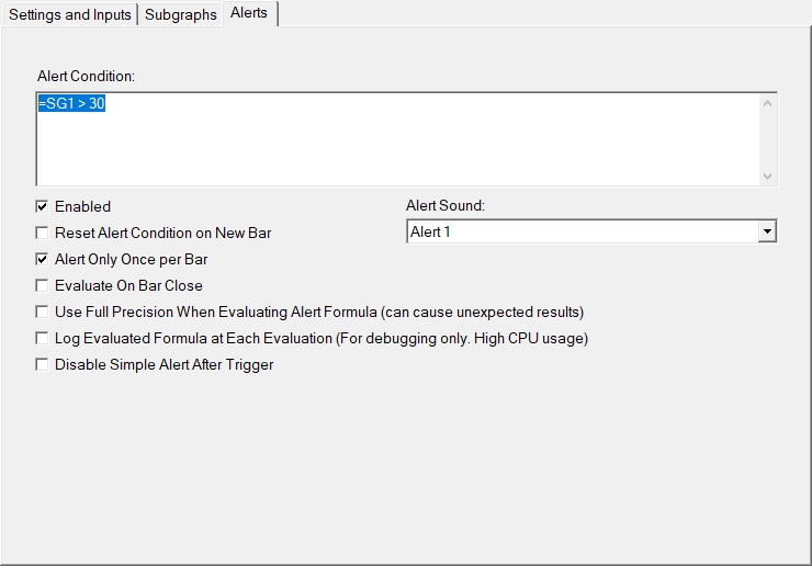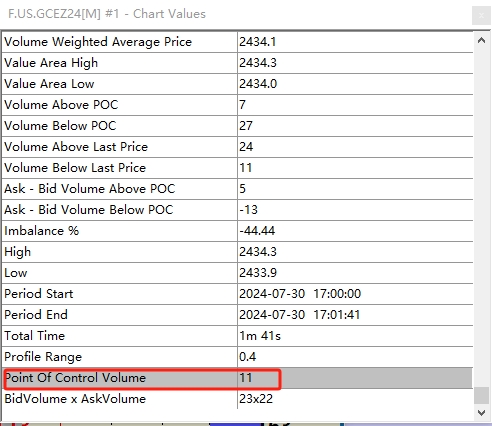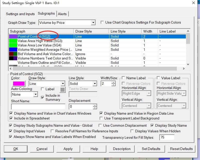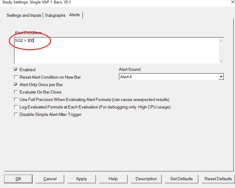 You can not get the value you want in the way you are doing it. But since you are wanting this on a "Per Bar" basis, it is not too hard to do. Do the following: - Add the "Volume Point of Control for Bars" study. This will give you the actual price of the Point of Control for each bar. You can remove the Volume by Price study, unless you want this for something else. - Add the "Spreadsheet Formula" study to the chart and enter the following formula for this study: =VAP(ID1.SG1) Where ID1 is the ID of the "Volume Point of Control for Bars" study. This study now gives you the Volume at that Point of Control for each bar. - Enter the following formula on the Alerts tab for the "Spreadsheet Formula": =SG1 > 300 If you enter the alert on a different study, or on the Chart Settings, then you would need to also reference the ID for the Spreadsheet Formula in the Alert formula. Refer to the following: Volume Point of Control for Bars Spreadsheet Formula Study/Chart Alerts And Scanning: VAP Study/Chart Alerts And Scanning: Referencing Other Studies on the Chart For the most reliable, advanced, and zero cost futures order routing, use the Teton service: Sierra Chart Teton Futures Order Routing |
