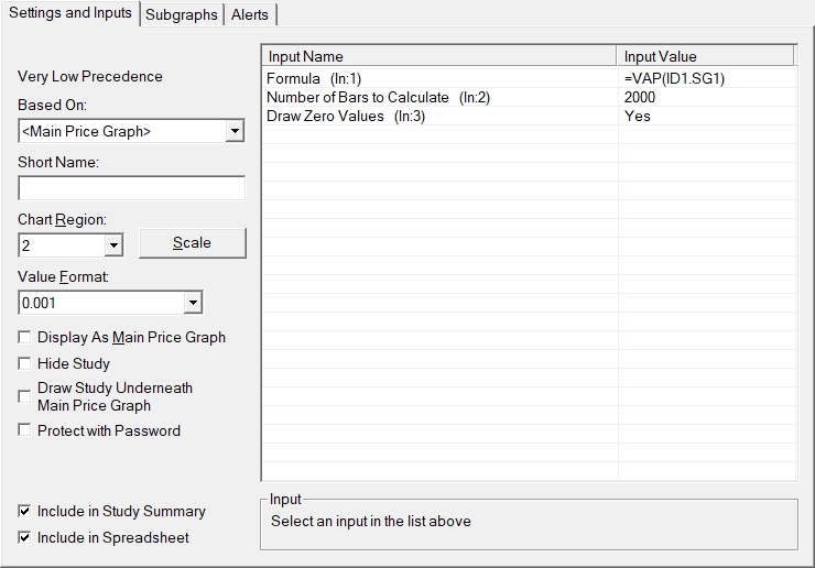 Use this formula in the Formula field of the Spreadsheet Formula study: =VAP(ID1.SG1,0) Study/Chart Alerts And Scanning: VAP Suggestion: To see a visual where the alert is TRUE, add the Color Bar Based On Alert Condition study, with a formula like this on its Alerts tab: =ID2.SG1 > 300 where ID2 is the Spreadsheet Formula study. Date Time Of Last Edit: 2024-07-31 23:47:09