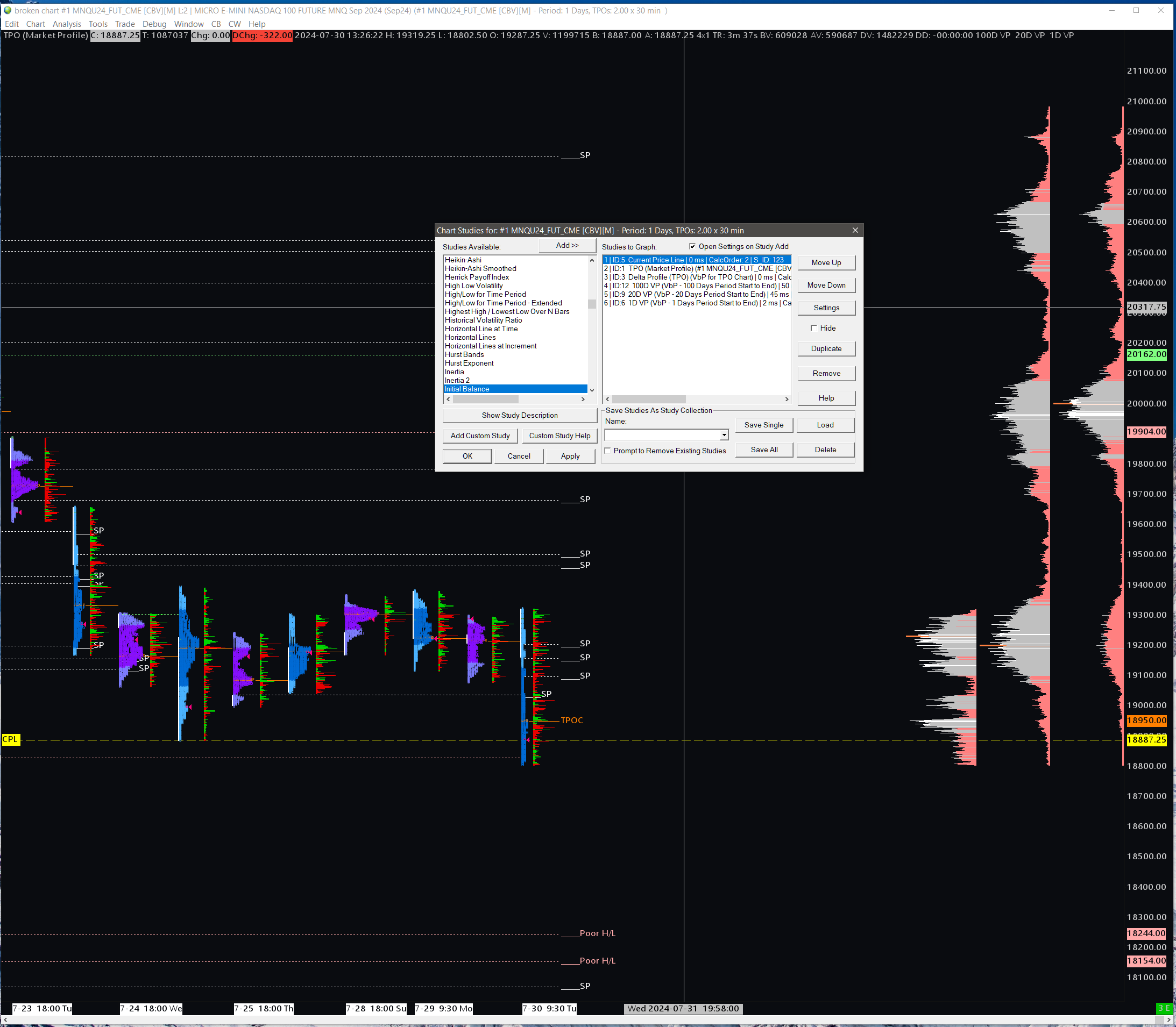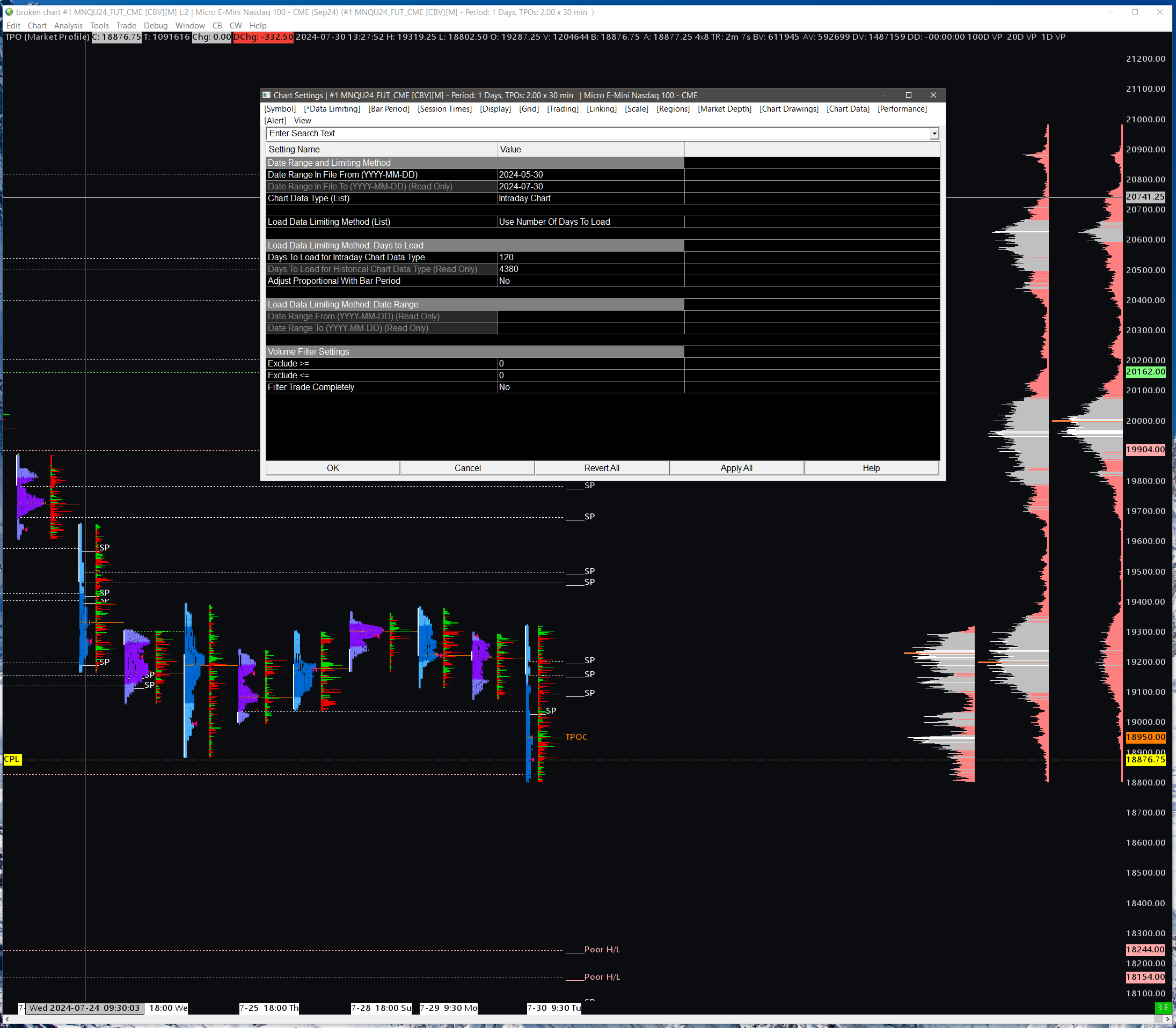 The attached chartbook has a fairly common Daily TPO with a Delta Distribution showing both ETH and RTH for MNQ. One the right you will see 1, 20, and 100 Day Volume by Price Study. You can see the studies in the screen shot and also that I have 180 days of data loading. BUT, the 100 day volume profile is NOT correct. As you can see if it range limited to the same as the 20 day which is really odd. Not sure what is going on... Please help, Anthony |