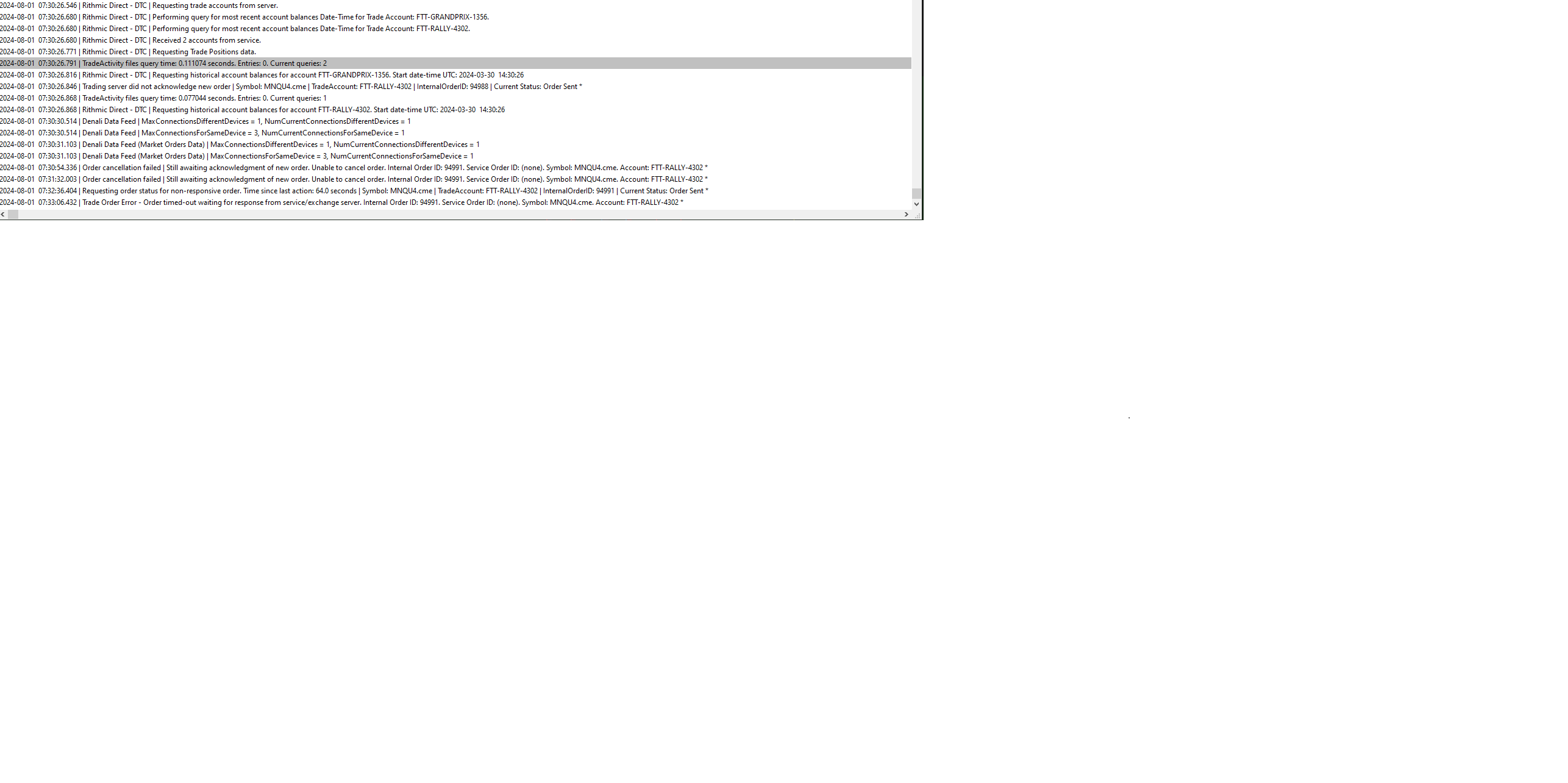 Each time I place a trade, all my charts freeze and it starts to download historical data, once all data is downloaded and my charts unfreeze and I try to cancel my order I get the following error message from the trade service log " 2024-08-01 07:31:32.003 | Order cancellation failed | Still awaiting acknowledgment of new order. Unable to cancel order. Internal Order ID: 94991. Service Order ID: (none). Symbol: MNQU4.cme. Account: FTT-RALLY-4302 * 2024-08-01 07:32:36.404 | Requesting order status for non-responsive order. Time since last action: 64.0 seconds | Symbol: MNQU4.cme | TradeAccount: FTT-RALLY-4302 | InternalOrderID: 94991 | Current Status: Order Sent * 2024-08-01 07:33:06.432 | Trade Order Error - Order timed-out waiting for response from service/exchange server. Internal Order ID: 94991. Service Order ID: (none). Symbol: MNQU4.cme. Account: FTT-RALLY-4302 * " Please advise. I contacted the prop firm FTT and they said it has nothing to do with them. |