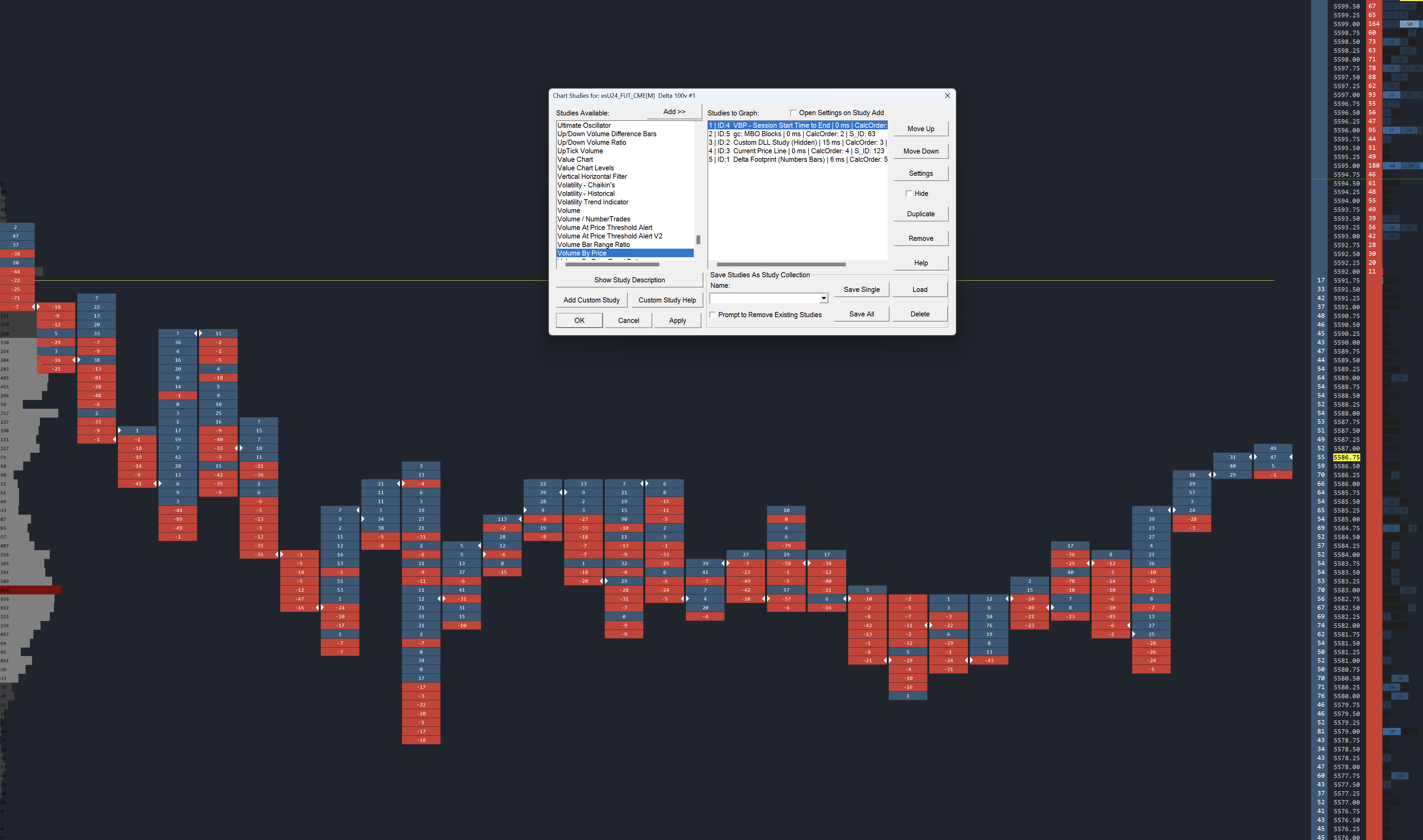 Put Numbers Bars at the top of the list of studies: Chart Studies: Study Display Order And then uncheck this option for the Volume by Price study: Chart Studies: Settings and Inputs Tab >> Draw Study Underneath Main Price Graph (in the same Chart Region) Sierra Chart Support - Engineering Level Your definitive source for support. Other responses are from users. Try to keep your questions brief and to the point. Be aware of support policy: https://www.sierrachart.com/index.php?l=PostingInformation.php#GeneralInformation For the most reliable, advanced, and zero cost futures order routing, use the Teton service: Sierra Chart Teton Futures Order Routing |