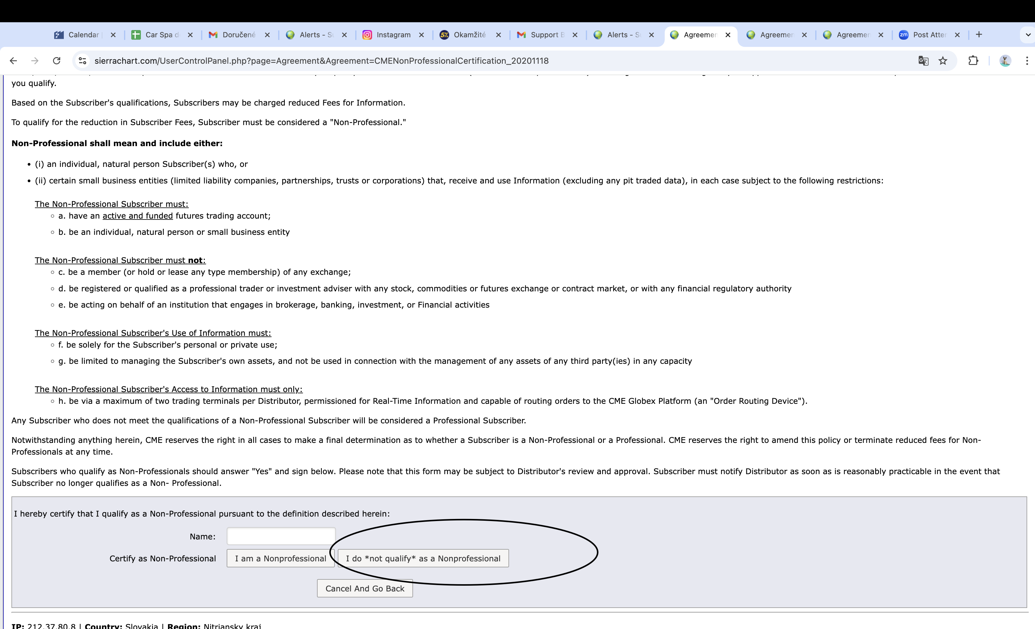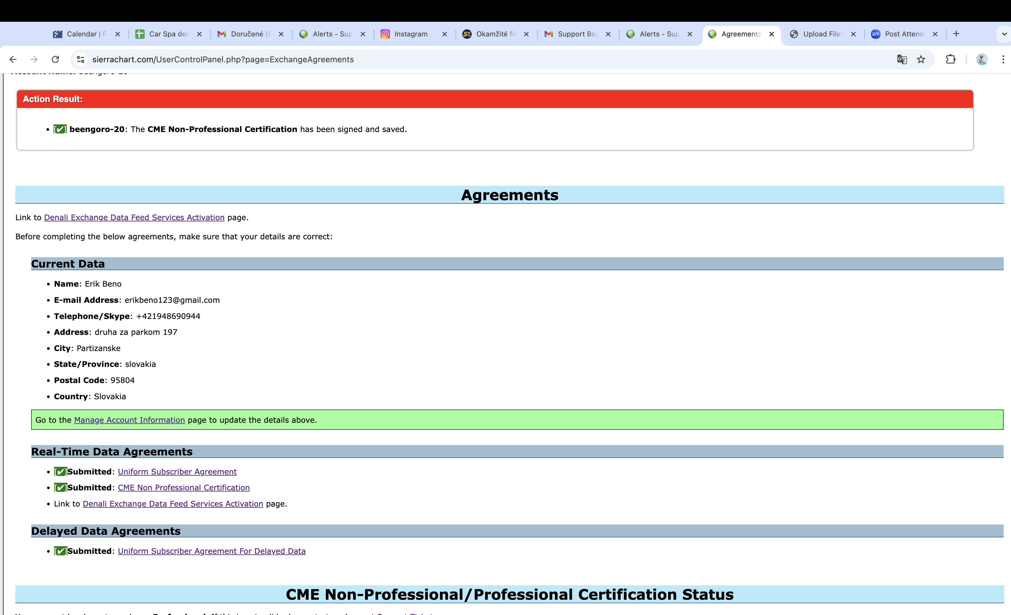 What do you mean by "foreign money"? It does not matter what currency you are trading in. If you are trading other people's money then you are considered a Professional, and you would need to pay for the professional exchanges. Which is what you are forced to do now, so if this is the case, then you do not need to do anything further. Just active the exchange(s) you want at the following link: https://www.sierrachart.com/UserControlPanel.php?page=DenaliDataFeed#Exchanges If you are not trading other people's money, then fill out the agreement and mark that you are a "Non-Professional". For the most reliable, advanced, and zero cost futures order routing, use the Teton service: Sierra Chart Teton Futures Order Routing |