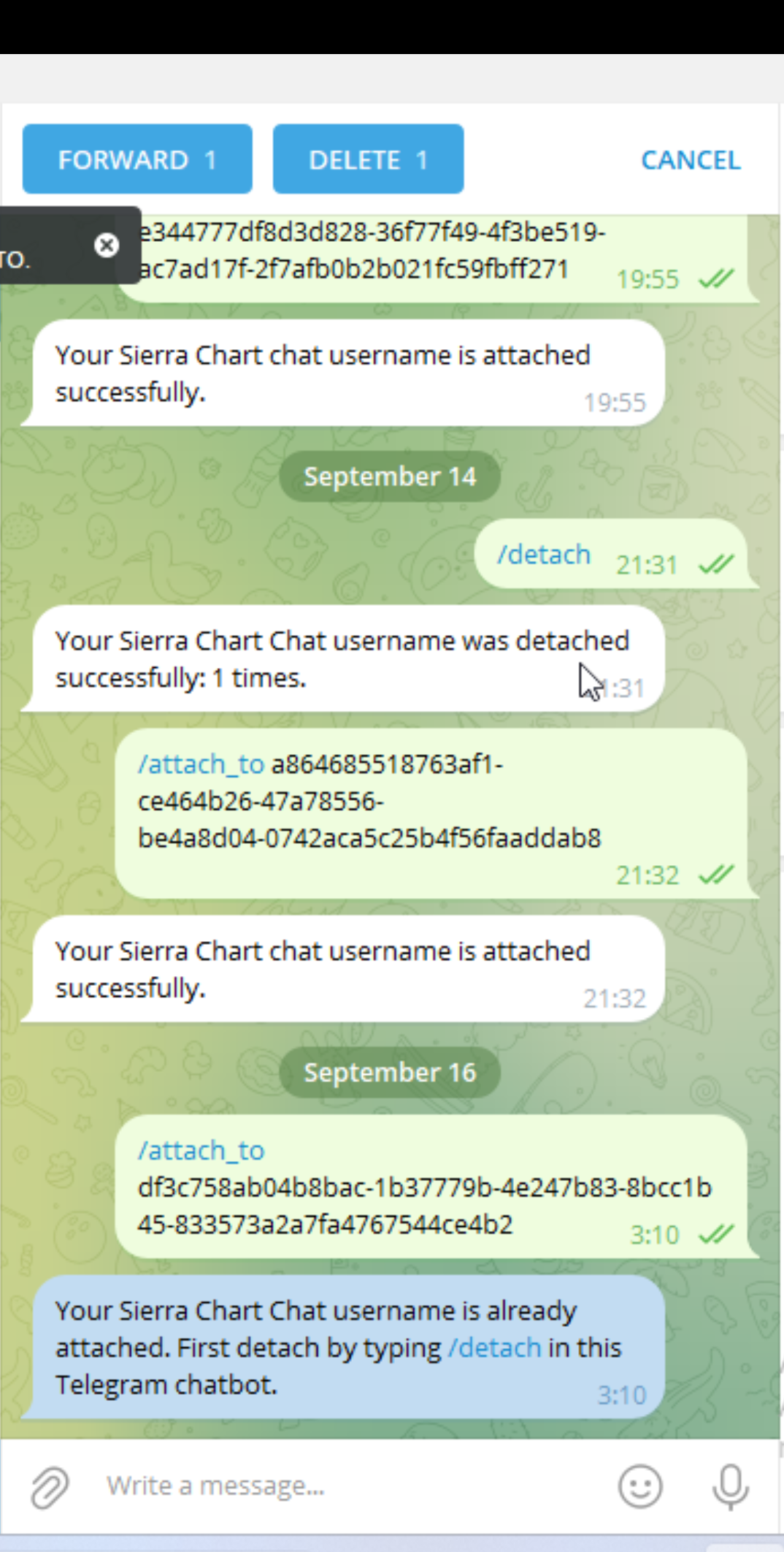 We are not understanding your question. In the image you provided you were already attached to Telegram, so you did not need to attach again. For the most reliable, advanced, and zero cost futures order routing, use the Teton service: Sierra Chart Teton Futures Order Routing |