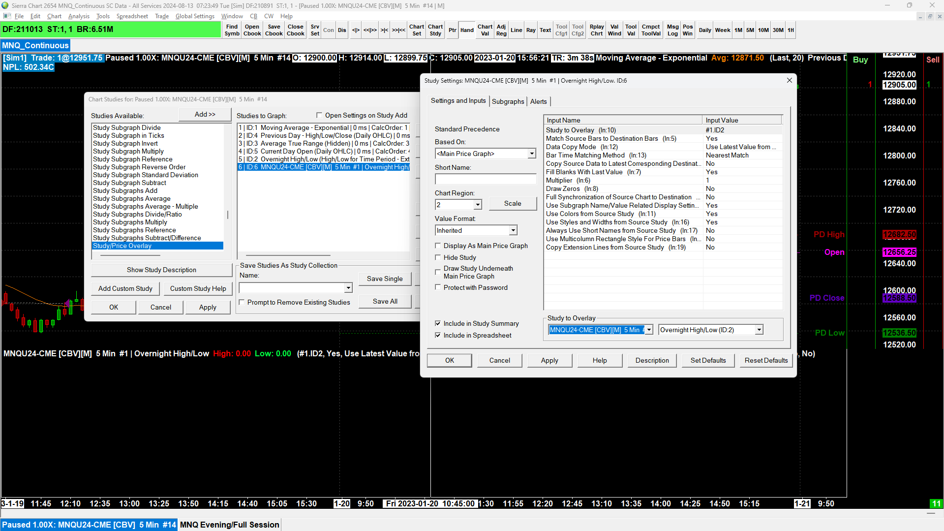 **Edit** I've solved this by updating the 'number of days to calculate' to 999. Thanks John. I've tried to set this up as you described, but I cannot see the overlayed data. One potential complication is that I'm using the Chart Replay function, so the new (evening session) chartbook isn't synced. Could this be an issue, or will it map the data accordingly? I've attached a screenshot of my settings. Please let me know if I've missed something. I presume also that I want to set the chart region to 1 in order to overlay the data? For now I've left it as default. Date Time Of Last Edit: 2024-08-13 14:54:24