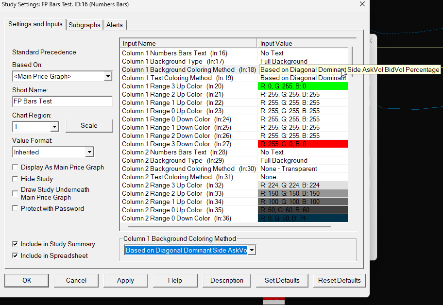 Version 2683 is the current Pre-Release and it has the updates to the Numbers Bars for two different Inputs to control whether diagonal comparisons are done at the high and low, and whether comparisons are done with zero values as ones. This also brings the coloring of the background and the numbers into alignment. Refer to the following and the item below it: Numbers Bars: Enable Diagonal Bid/Ask Compare with No Data at High/Low For the most reliable, advanced, and zero cost futures order routing, use the Teton service: Sierra Chart Teton Futures Order Routing |