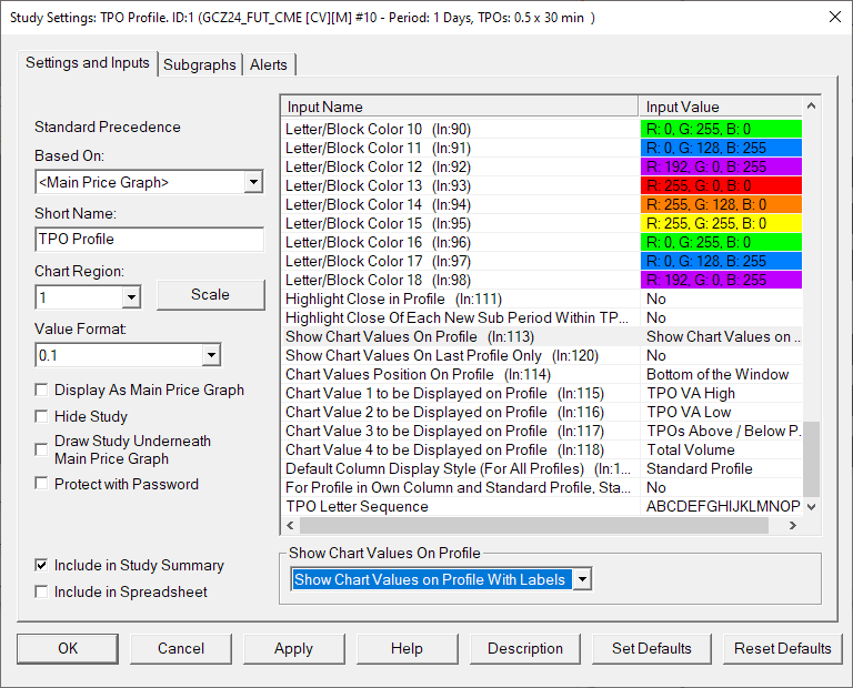 Dear John: I was hoping you may be able to assist with two matters: 1) TPO Profile Chart Values I am not able to see the TPO values on the chart. Playing around with the settings (ln:113-118,120 & 127) yielded - no result. The Chart Values for the VbP study works fine. Below is an image of a TPO & Volume By Price chart -- https://www.sierrachart.com/image.php?Image=1723755381781.png A screen shot of the study settings was also attached. Not sure if it was accepted? 2) TPO Profile Value Lines on Another Chart I would like to draw the TPO Value Lines on a normal graph. The data of the Volume Value Areas slightly different from the TPO's. I tried an Overlay Study, but the Subgraphs do not have Value Area High/ Low/ Point or Control present. Any advice here? Many thanks. Regards, Ben |