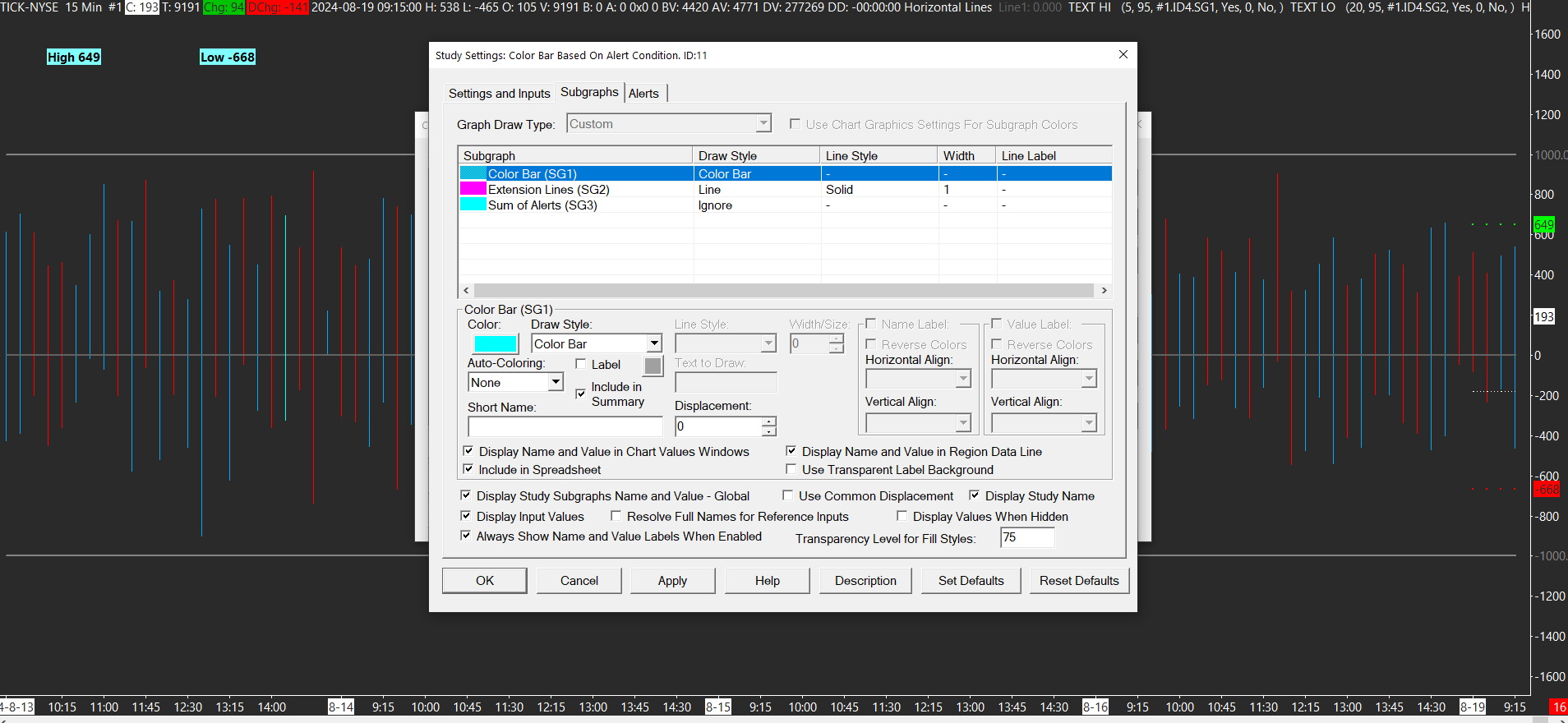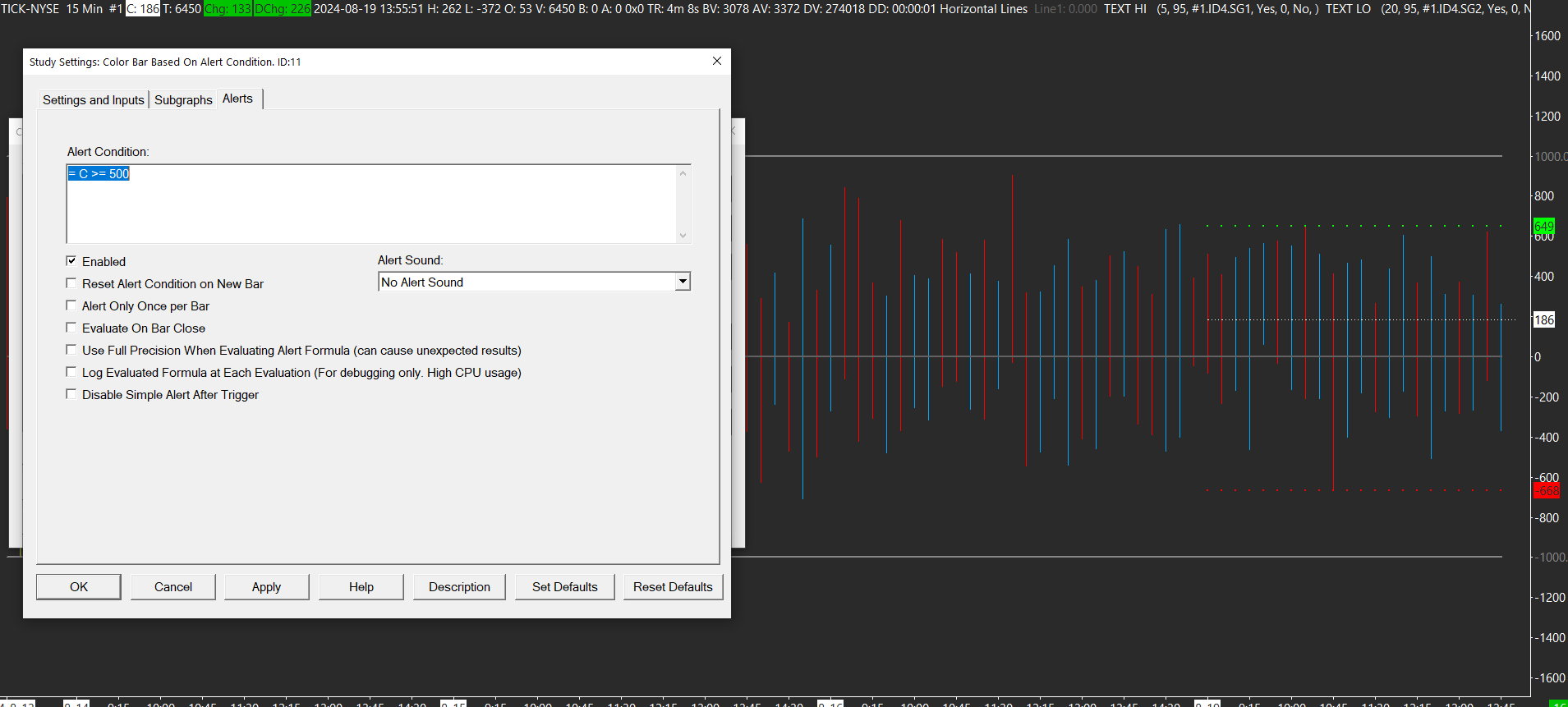 I am trying to do an alert when in TICK-NYSE chart the bar is over 500. Trying to put formula inside of Color Bar Based on Alert Condition, but for some reason it is not triggering bar color change.