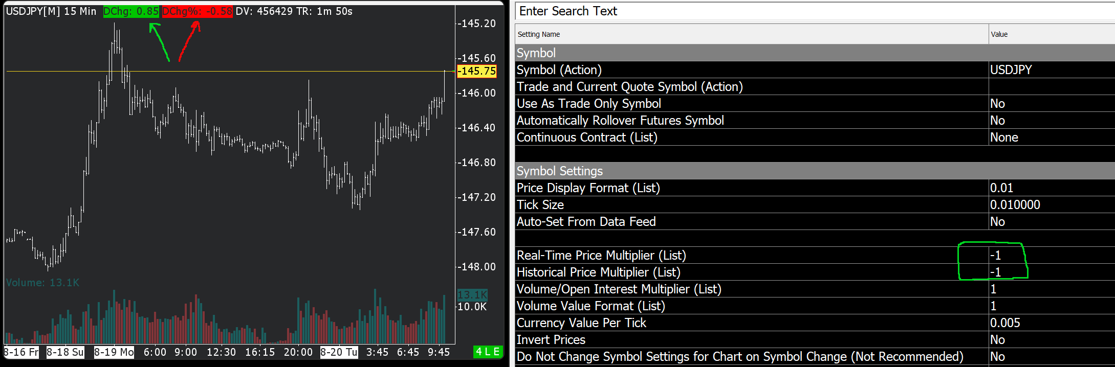 For USDJPY I set the real-time and historical multiplier to -1 and it works beautifully as expected. The chart header correctly shows a positive "DChg" but still shows the "DChg%" as negative. This is a minor issue but I wanted to point it out. |