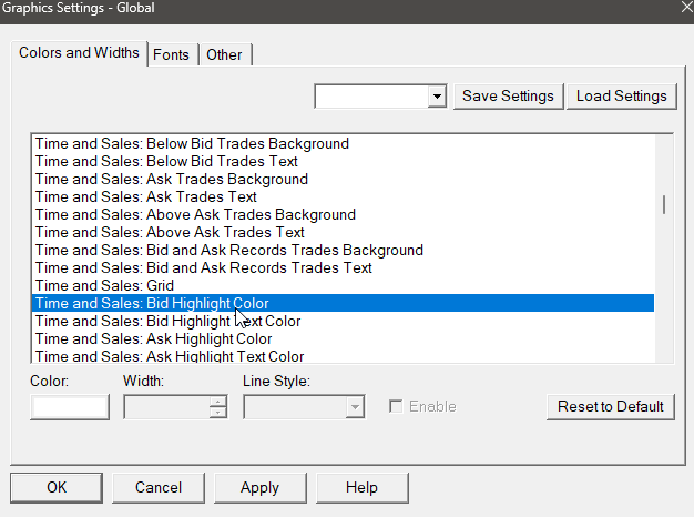 We wonder if you have the Graphics Settings for "Time and Sales: Below Bid Trades Background" and "Time and Sales: Above Ask Trades Background" set differently from the "Time and Sales: Bid Trades Background" and "Time and Sales: Ask Trades Background". This would create what you are seeing. Refer to the following: Graphics Settings: Time and Sales: Below Bid Trades Background Graphics Settings: Time and Sales: Above Ask Trades Background For the most reliable, advanced, and zero cost futures order routing, use the Teton service: Sierra Chart Teton Futures Order Routing |