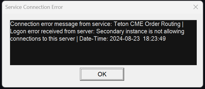 Hi, I am unable to connect to Teton and/or Denali- I get the error message in the attached screenshot. "Secondary instance is not allowing connections to this server". I was logged in and using the service just fine when this suddenly happened. Never had an issue like this. No other instance of Sierra installed anywhere. I tried shutting Sierra down and restarting- same issue occurs when I start Sierra back up. ***** Edit at 20:35 EST ***** It just reconnected by itself. I didn't touch anything and just left it on. For some reason I lost connectivity earlier on as described above for over an hour. Date Time Of Last Edit: 2024-08-24 00:36:35