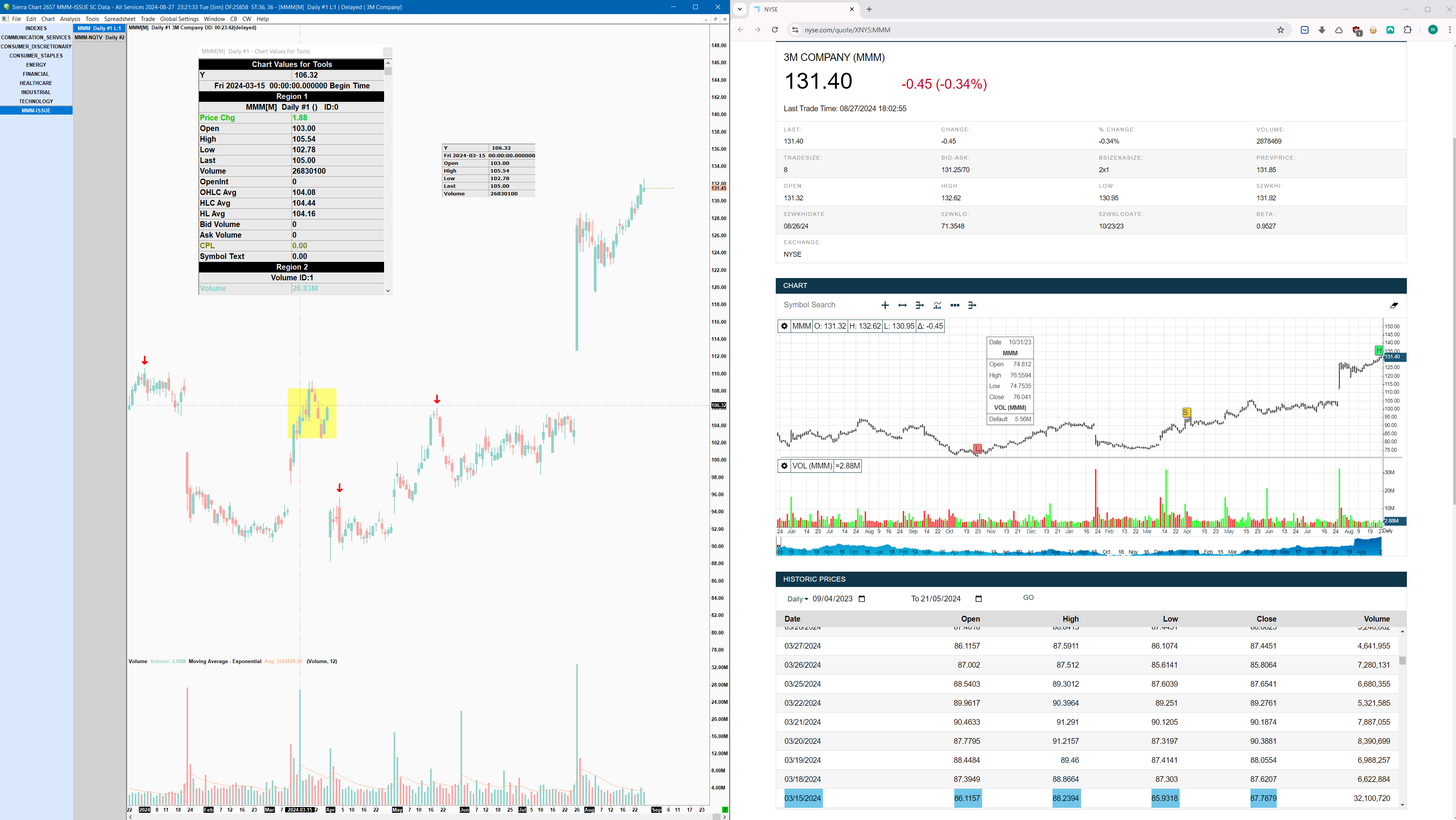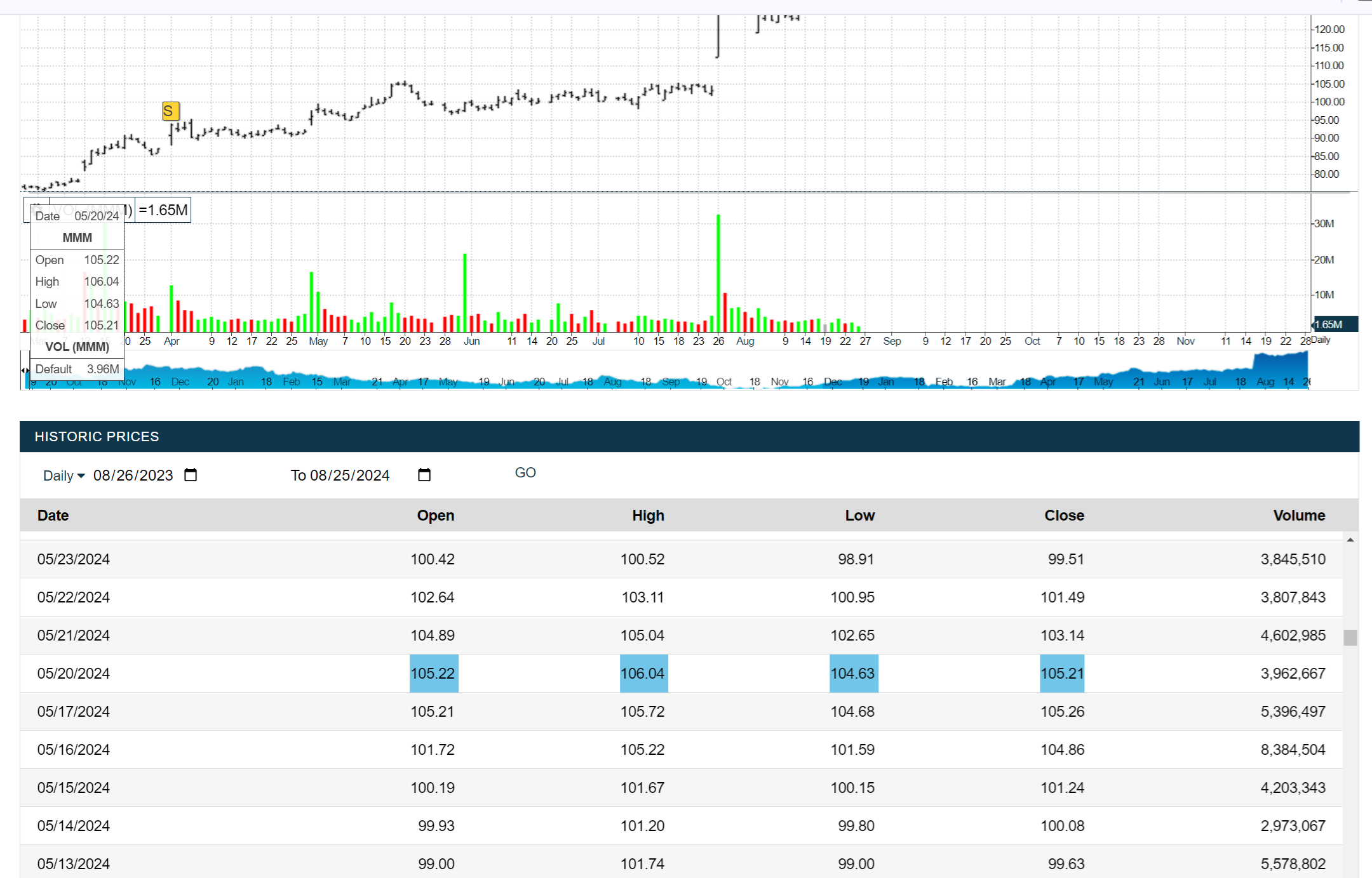 thank you for your response. I should have formulated my question more accurately - i meant to point your attention to the peaks of price swings in my markings, which don't match between Sierra and NYSE. As requested, please see price comparison below: DATE: 2024 March 15 SIERRA: Open: 103.00 High: 105.54 Low: 102.78 Last: 105.00 NYSE: Open: 86.11 High: 88.23 Low: 85.93 Close: 87.78 Volumes are different as well. As you see the difference is not insignificant, its almost 20% See the screenshot of the entire screen with both Sierra (including chart values) and NYSE info attached. In Sierra - I have also marked a few consecutive days after March 15 which show MMM traded between ~102 and ~109 (marked in yellow rectangle), but you will also see that most of those days traded roughly ~87 - ~90 according to NYSE table. I think this is when the stock split happened, maybe that somehow has an influence on this discrepancy, but im not sure. Please let me know if I can provide further information Thank you |