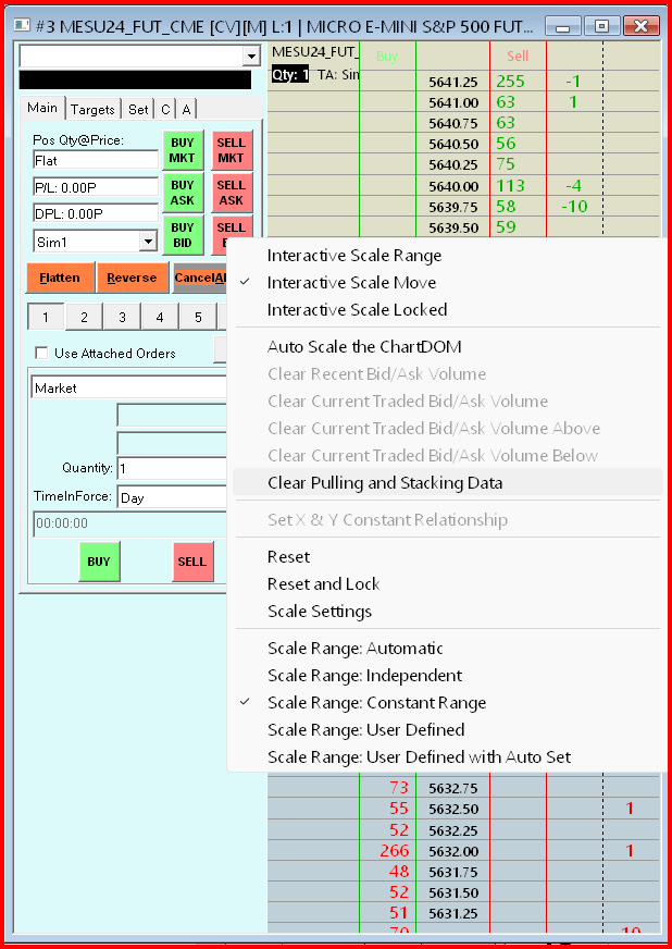 There is not a way to reset the Pulling/Stacking at a set time interval. Just the option to clear it on the right-click in the DOM. You could create a custom study to do this. There is a function named sc.ClearMarketDepthPullingStackingData() to do this. It is not yet documented, but you can find the format for it in the Sierrachart.h file in your ACS_Source folder. Refer to the following: How to Build an Advanced Custom Study from Source Code https://www.sierrachart.com/index.php?page=doc/SierraChartStudyAndSystemProgrammers.php For the most reliable, advanced, and zero cost futures order routing, use the Teton service: Sierra Chart Teton Futures Order Routing |