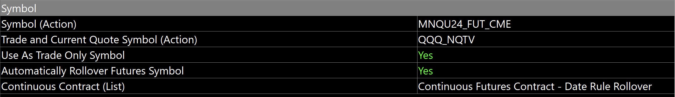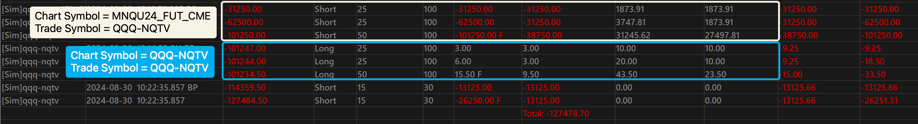 Is it possible to use MNQU24_FUT_CME as the chart symbol and QQQ-NQTV as the trade symbol? I tried this in sim and the P&L values were correct in the trade drawings, but the P&L values in the trade activity were calculated using MNQ contracts rather than QQQ shares. |