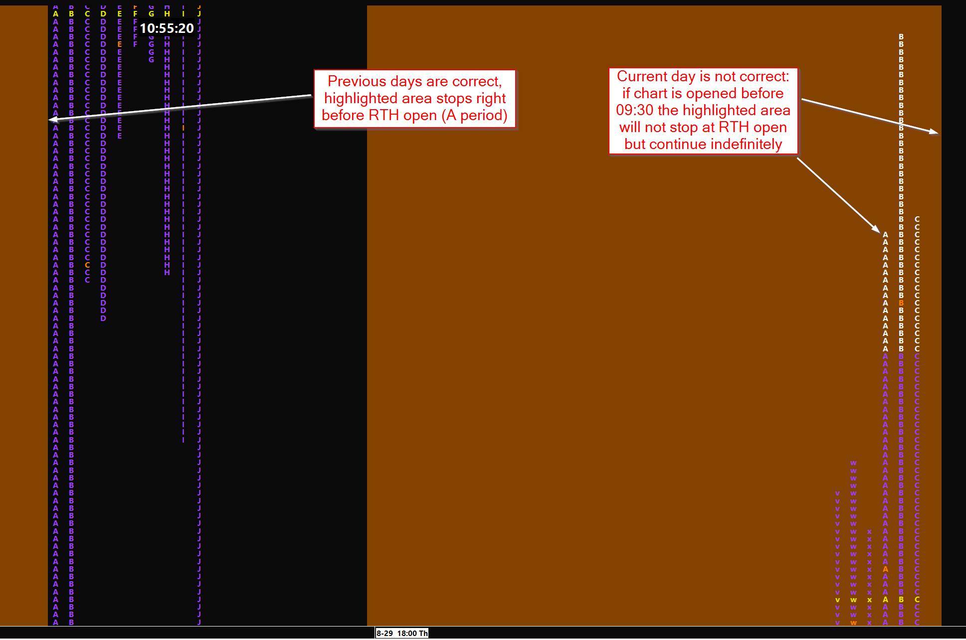 I see, thanks for the fast reply John. Is there maybe any other way to mark / highlight the beginning of the RTH session on the TPO chart (other than using the Time Range Highlight)? I'm usually not using letters but blocks on the TPO, so I need a way to somehow visually separate RTH and ETH. |