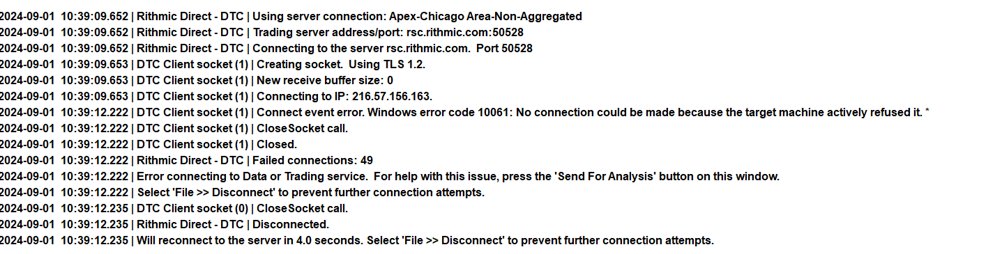 Hi, I have a funded account that I use however when connected I have a message log that will try and connect to IP then the next log will say 'CONNECT EVENT ERROR. WINDOWS ERROR CODE 10061. NO CONNECTION COULD BE MADE BECAUSE THE TARGET MACHINE ACTIVELY REFUSED IT'. It then says it is closed and then will attempt to re-connect constantly. I do not have issues trading and my orders will go through however do not understand the message log of it failing to connect. I have added a screenshot of the messages I am receiving. |