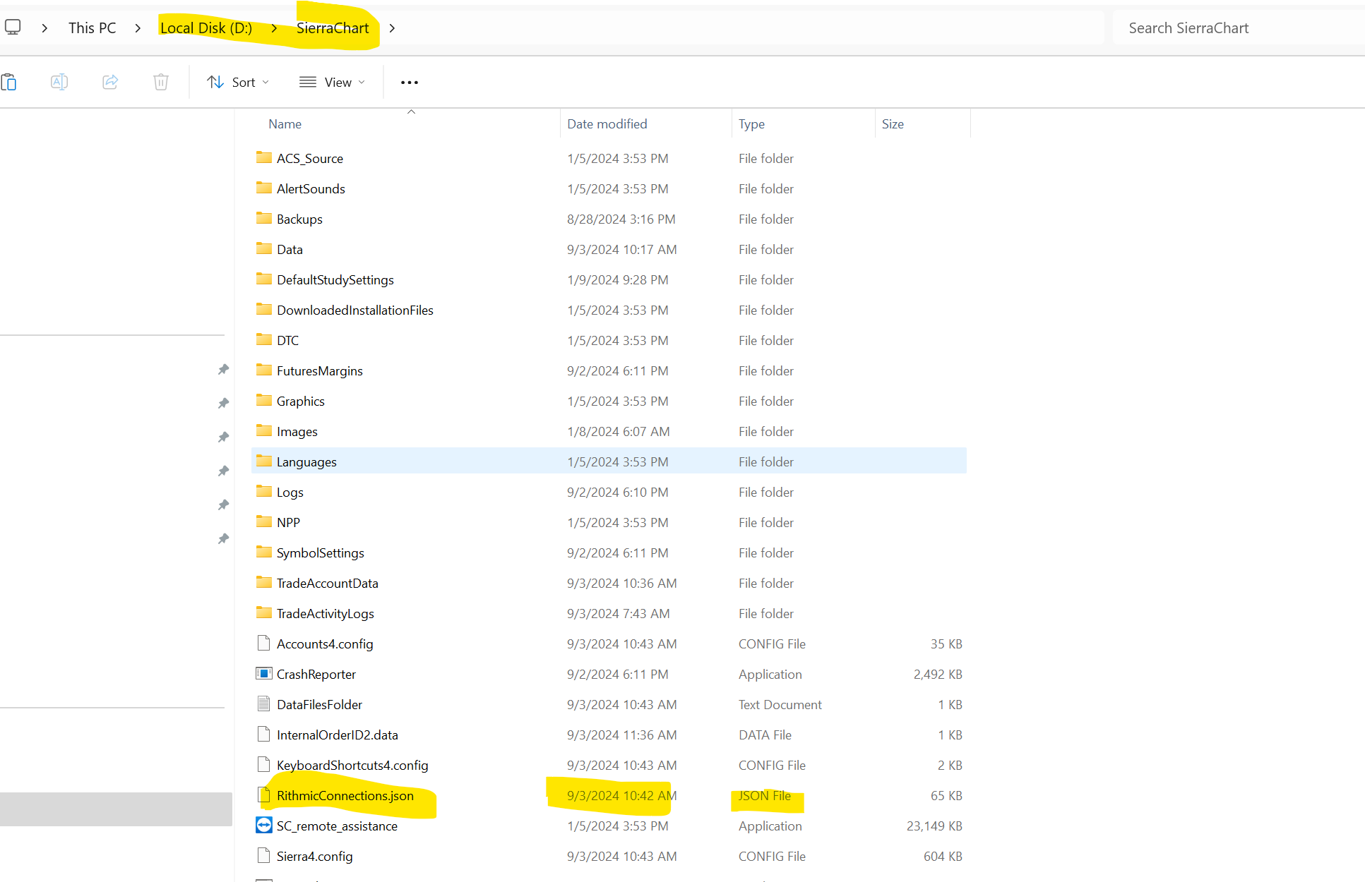 Updated the RithmicConnections.json File to D:\SierraChart\ folder, but still same issue.