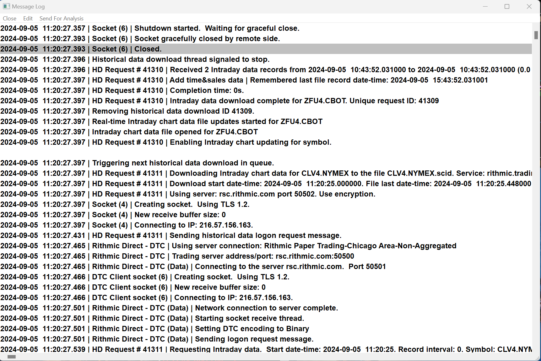 I just restarted Sierra chart and selected Rithmic direct - DTC , waited for 5 minutes. Message logs attached here but i don't see any message related to this issue. 2024-09-04 11:55:26.808 | Trade activity files set size: 324 2024-09-04 11:55:26.841 | Reading Internal Order ID file. 2024-09-04 11:55:26.843 | Reading Trade Orders file. 2024-09-04 11:55:26.843 | Reading Trade Positions file. 2024-09-04 11:55:26.843 | Reading Trade Account Data files. 2024-09-04 11:55:26.844 | Software version: 2671 64-bit 2024-09-04 11:55:26.844 | Primary Thread ID: 45488 2024-09-04 11:55:26.844 | Usage end date: 2024-09-09 2024-09-04 11:55:26.844 | Enabled for: Advanced Features 2. 2024-09-04 11:55:26.844 | Enabled for: Sierra Chart Historical Data Service. 2024-09-04 11:55:26.844 | Enabled for: Denali Real-Time Exchange Data Feed. 2024-09-04 11:55:26.844 | Enabled for: Delayed Denali Exchange Data Feed. 2024-09-04 11:55:26.844 | Enabled for exchange2: CME 2024-09-04 11:55:26.844 | Allow Support for Sierra Chart Data Feeds is enabled. 2024-09-04 11:55:26.844 | Current selected Data/Trading service: Teton CME Order Routing 2024-09-04 11:55:26.844 | Custom symbol settings values: enabled 2024-09-04 11:55:26.844 | Chart Update Interval: 400 2024-09-04 11:55:26.844 | Intraday Data Storage Time Unit: 0 2024-09-04 11:55:26.844 | Time Zone: -05:00:00 (CST-06CDT+01,M3.2.0/02:00,M11.1.0/02:00) 2024-09-04 11:55:26.844 | 2024-09-04 16:55:26 Local computer time in UTC 2024-09-04 11:55:26.844 | 2024-09-04 11:55:26 Local computer time in SC Time Zone 2024-09-04 11:55:26.844 | 2024-09-04 16:55:25 Server time in UTC 2024-09-04 11:55:26.844 | Local computer UTC time and Server UTC time difference: 1 seconds. 2024-09-04 11:55:26.844 | Program path: D:\SierraChart\ 2024-09-04 11:55:26.844 | Data Files path: D:\SierraChart\Data\ 2024-09-04 11:55:26.844 | OS Version Number: 10.0 2024-09-04 11:55:26.844 | Locale Setting: C 2024-09-04 11:55:26.844 | DLLs: OrderFlowLabs.com.free_64.dll, OrderFlowLabs.com.free_ARM64.dll, UserContributedStudies_64.dll 2024-09-04 11:55:26.844 | Allowed protected custom studies: OrderFlowLabs.com FREE 2024-09-04 11:55:26.844 | Crash reporter started: true 2024-09-04 11:55:26.844 | 2024-09-04 11:55:26.844 | Checking for new symbol settings. Requested symbol settings MD5 for service code sc_futures_direct.dtc.trading. Request ID: 1. 2024-09-04 11:55:26.873 | HTTPS connection ID:1 to login.sierrachart.com:443 for request ID:1 (1) | Shutdown started. Waiting for graceful close. 2024-09-04 11:55:27.034 | HTTPS connection ID:1 to login.sierrachart.com:443 for request ID:1 (1) | Socket gracefully closed by remote side. 2024-09-04 11:55:27.034 | HTTPS connection ID:1 to login.sierrachart.com:443 for request ID:1 (1) | Closed. 2024-09-04 11:55:27.313 | Received 5 login tokens. 2024-09-04 11:55:27.829 | Symbol settings MD5 received. Request ID: 1. 2024-09-04 11:55:27.829 | Symbol settings are up-to-date for sc_futures_direct.dtc.trading. 2024-09-04 11:55:29.347 | Requested user files to download. 2024-09-04 11:55:30.086 | File to download: OrderFlowLabs.com.free_64.dll. Action: 1 2024-09-04 11:55:30.098 | File to download: OrderFlowLabs.com.free_ARM64.dll. Action: 1 2024-09-04 11:55:30.101 | User files to download complete 2024-09-04 11:55:31.348 | 2024-09-04 11:55:31.351 | Teton CME Order Routing | Firm: Phillip Capital 2024-09-04 11:55:31.354 | Teton CME Order Routing | Connecting to the server futurestrading14.sierracharts.com. Port 11089 2024-09-04 11:55:31.384 | DTC Client socket (1) | Creating socket. Using TLS 1.2. 2024-09-04 11:55:31.384 | DTC Client socket (1) | New receive buffer size: 0 2024-09-04 11:55:31.384 | DTC Client socket (1) | Connecting to IP: 208.185.224.130. 2024-09-04 11:55:31.423 | Teton CME Order Routing | Network connection to server complete. 2024-09-04 11:55:31.423 | Teton CME Order Routing | Starting socket receive thread. 2024-09-04 11:55:31.423 | Teton CME Order Routing | Sending encoding request to server: Binary VLS. Compression: none 2024-09-04 11:55:31.524 | Teton CME Order Routing | Setting DTC encoding to Binary VLS 2024-09-04 11:55:31.524 | Teton CME Order Routing | Sending logon request message. 2024-09-04 11:55:32.039 | Teton CME Order Routing | Received logon response. 2024-09-04 11:55:32.039 | Teton CME Order Routing | Server Name: SC DTC Server. Build=50039. 2024-09-04 11:55:32.039 | Teton CME Order Routing | Server protocol version: 8. Client protocol version: 8 2024-09-04 11:55:32.039 | Teton CME Order Routing | Successfully connected. Connected to SC DTC Protocol server. Service=cme_ilink.trading|SymbolSettings=cme_ilink_live.trading. 2024-09-04 11:55:32.039 | Teton CME Order Routing | Trading is supported. 2024-09-04 11:55:32.039 | Teton CME Order Routing | Order cancel and replace is supported. 2024-09-04 11:55:32.039 | Teton CME Order Routing | OCO Orders supported. 2024-09-04 11:55:32.039 | Teton CME Order Routing | Bracket Orders supported. 2024-09-04 11:55:32.039 | Teton CME Order Routing | MarketDepthIsSupported: 1 2024-09-04 11:55:32.039 | Teton CME Order Routing | Connected to server complete. 2024-09-04 11:55:32.040 | No download requests in the queue to start downloads for. | Number times message added: 3 2024-09-04 11:55:32.040 | Teton CME Order Routing | Performing query for most recent Order Activity Date-Time. 2024-09-04 11:55:32.043 | Teton CME Order Routing | Requesting historical order activity from server. Start date-time UTC: 2024-09-04 16:52:44.605966 2024-09-04 11:55:32.075 | Updated verified funded futures trading account ending date to: 2024-10-04 16:55:32 2024-09-04 11:55:32.075 | Teton CME Order Routing | Received final trade activity snapshot. Count=1. No data. TradeAccount=7PV3896 2024-09-04 11:55:52.065 | ExtendTheFundedTradingAccountStatusExpirationDate: Sending request. 2024-09-04 11:55:52.789 | ExtendTheFundedTradingAccountStatusExpirationDate | Result: {"Result":"The Funded Trading Account Status Expiration Date is more than 25 d