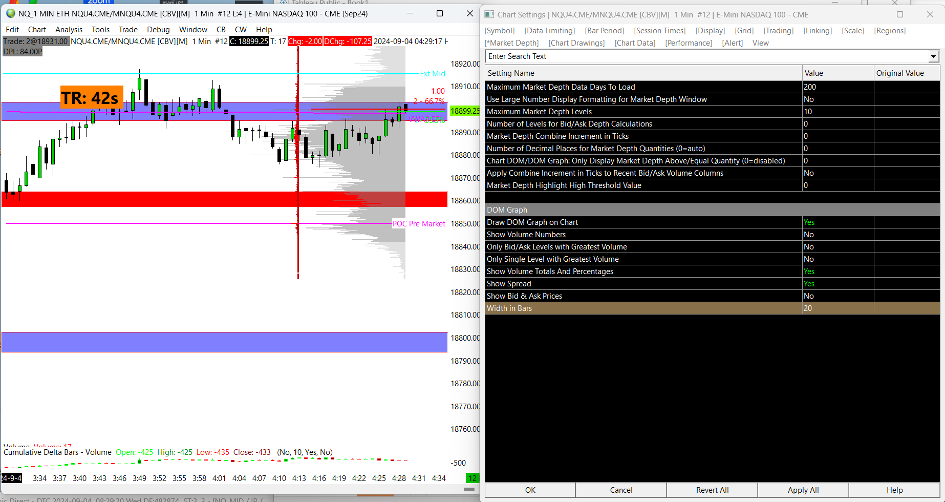 You do not have any exchanges activated that include Market Depth data, which is why you are only getting 1 level of the Market Depth data. Refer to the following: Real-Time Exchange Data Feeds Available From Sierra Chart: Adding Support for CME Market Depth Data Once you get that resolved, then you can change the thickness of the DOM Graph lines by changing the "Width" values for the "DOM Graph Ask Lines Begin Color" and "DOM Graph Bid Lines Begin Color". Refer to the following: Graphics Settings: DOM Graph Ask Lines Begin Color For the most reliable, advanced, and zero cost futures order routing, use the Teton service: Sierra Chart Teton Futures Order Routing |