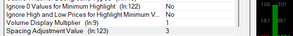 The minimum Spacing Adjustment Value of 3 does not move the values far enough to the right on my charts, and hides part of the first digit depending on the zoom level. Can this minimum be reduced to something like 0? It would also be useful for the Separator character to allow a few more options, like 5-6 spaces. |