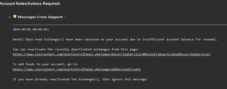 The notice about the data is from 9-1. So it was posted before you added funds and renewed your services. There is a "Hide" option at the bottom of the message that you can select to not show that particular message on the website for your account. The reason you are getting delayed data is that you have not connected to your live, funded, futures trading account since last month. Your "Verified Until" date is showing as "2024-09-07". You need to connect to your live account and have that date updated to 30 days in the future. Refer to the following: Real-Time Exchange Data Feeds Available From Sierra Chart: Connecting Only Once a Month to Trading Account to Support CME Group Exchange Fees You can view the "Verified Until" date for your account on the main control panel for your account on our website, or at the following link: https://www.sierrachart.com/UserControlPanel.php?page=DenaliDataFeed#Exchanges For the most reliable, advanced, and zero cost futures order routing, use the Teton service: Sierra Chart Teton Futures Order Routing |