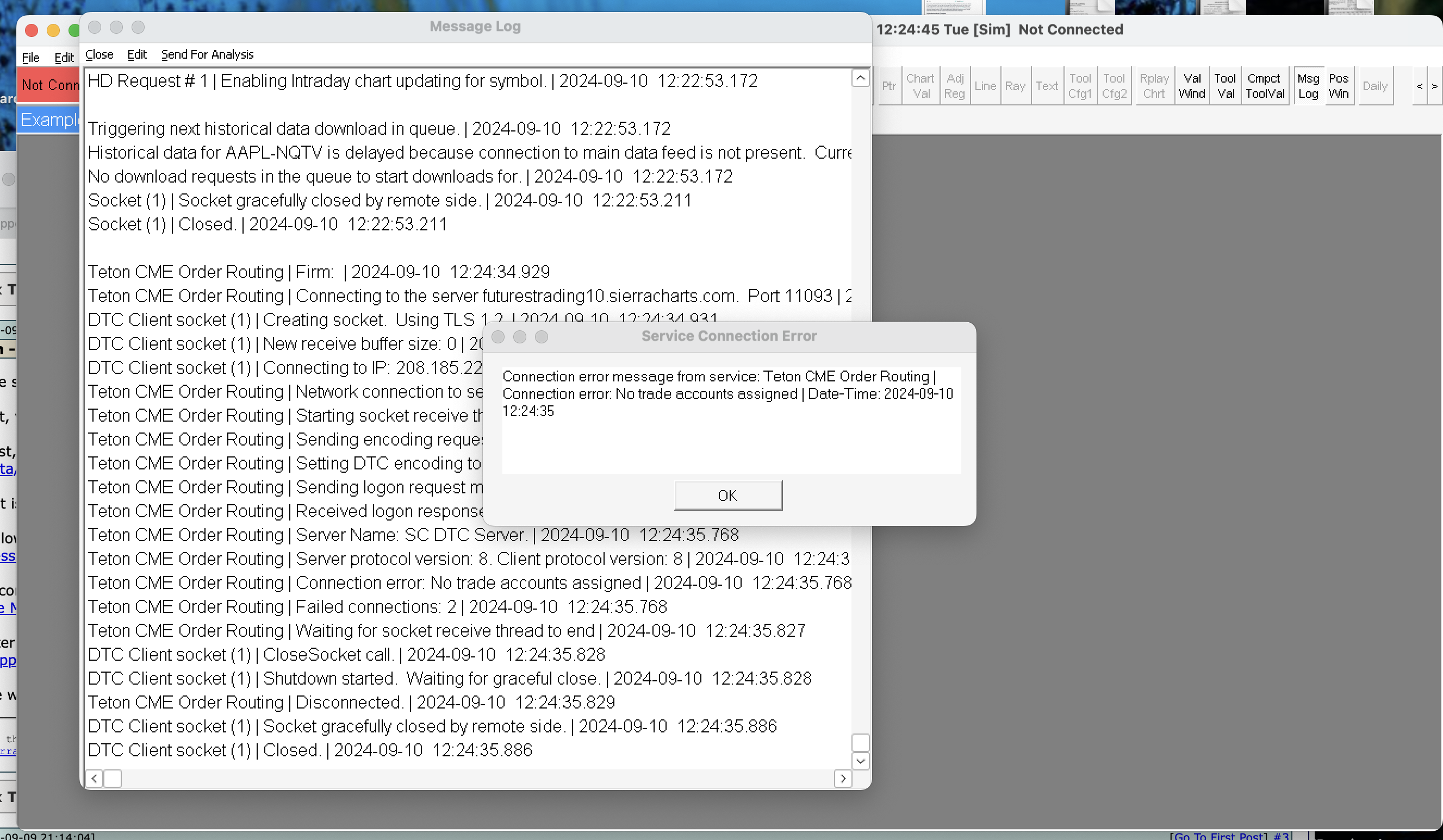 When I navigate to "File" --> "Connect to Data Feed" then I get an error window (images attached) of no trade account assigned. Might this be if my payments have not processed thru the Sierra system yet or otherwise? What would lead to these error windows to appear with screenshots attached? How can I see the data loading for the indices selected to view, rather than the window appearing saying "not connected, no trade account connected"? Thank you Date Time Of Last Edit: 2024-09-10 12:37:12