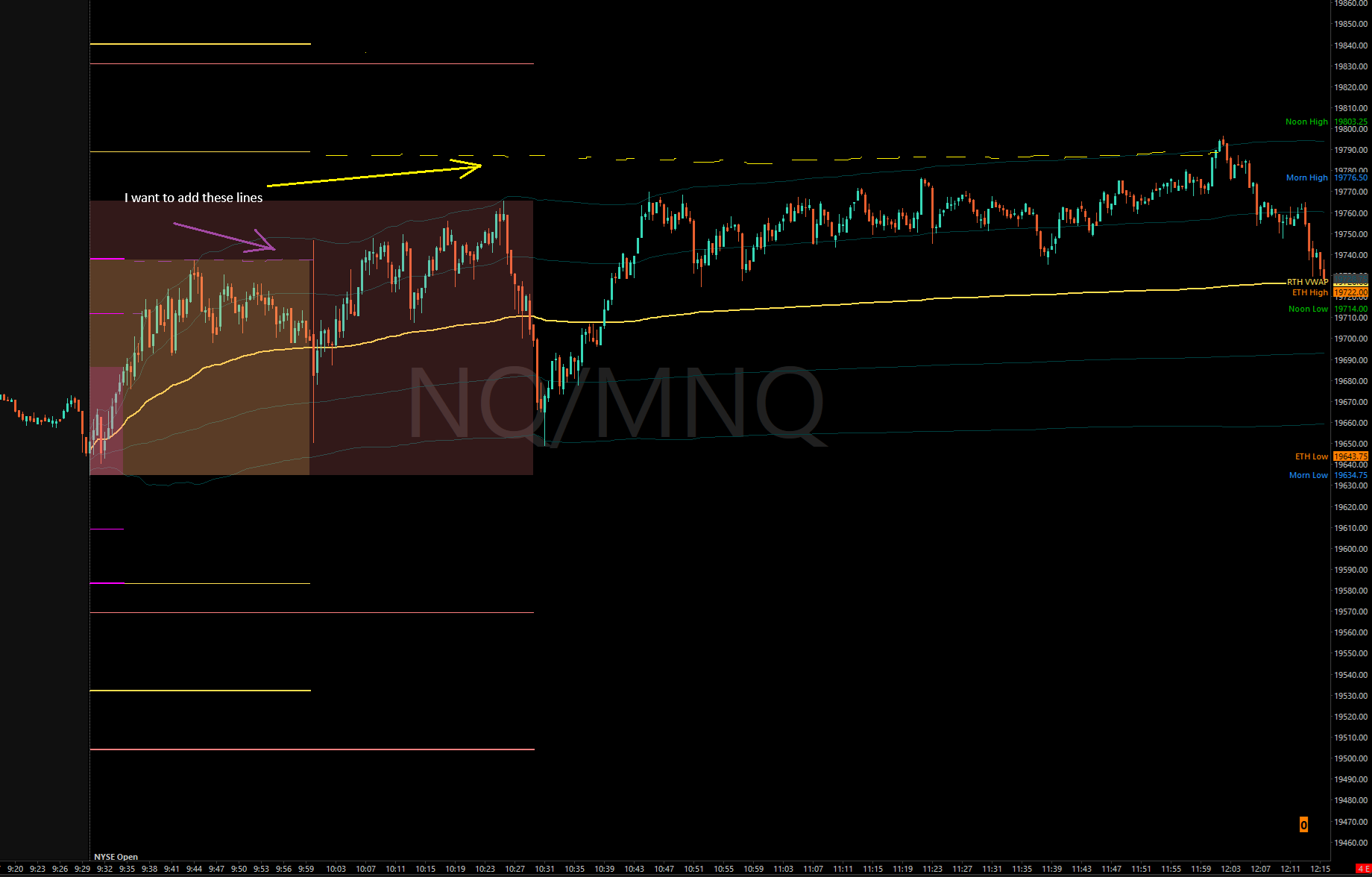 Hello! I am facing a strange problem, I cannot draw any horizontal line that lasts (maximum) until day's close and extends until future intersection. Although it seems to be very simple, I have lost so much time without success. More specifically: I have drawn the Opening Ranges for the first 5, 30 & 60 minutes with colored background as you see in the attached picture. Purple, yellow and orange respectively. These backgrounds stop their development at 9:34:59, 9:59:59 and 10:29:59 respectively in order to keep the chart as clean as possible. I have added the +/-50% and +/-100% opening range extensions as horizontal segments, as shown in the picture, with the same colors. These segments stop their development at the end of each corresponding period. So far so good. Now I want to add line extensions to all these +/-50% and +/-100% line segments, but not infinitely. The development of these new lines should evolve until future intersection. I have tried anything without success. Studies tried: - Horizontal Line at time - Swing High and Low - Study subgraph reference The horizontal line at time can be based on the <Main Price Graph> but cannot be based on any of the studies I have used for the calculation of these levels. Displays nothing Maybe some specific formula could be used but do not know anything about it... Could anybody help me? Many thanks in advance. |