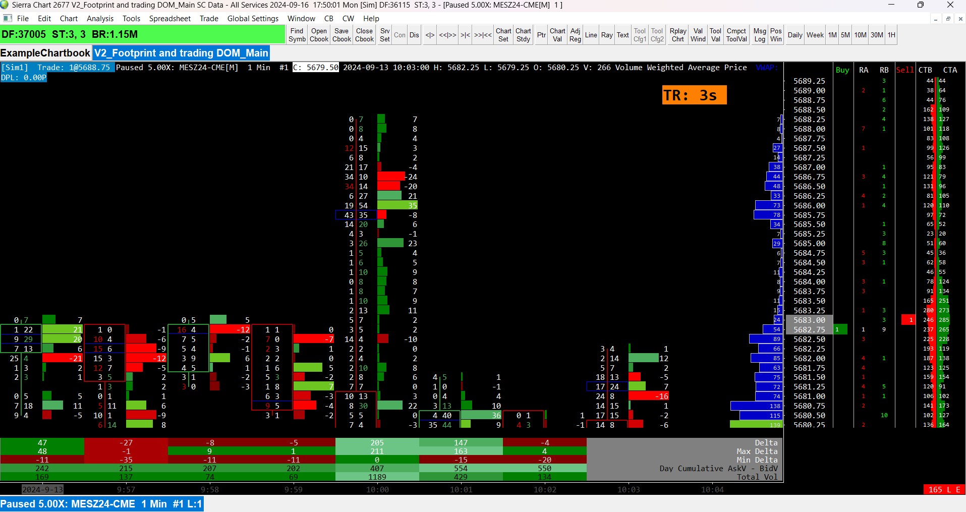 Not sure exactly your issue, but when following option is set to No I have noticed discrepancies in what actually traded on the DOM vs what Numbers Bar Study reports: Numbers Bar Study > Line 118: "Require 1 Tick Intraday Data Storage Time Unit" to YES Also, you're trading MES. Any reason you aren't doing it off a chart of ES? If you want to you can do as follows: Chart Settings > Symbol: ESZ24-CME Trade and Current Quote Symbol: MESZ24-CME Use As Trade Only Symbol: YES |