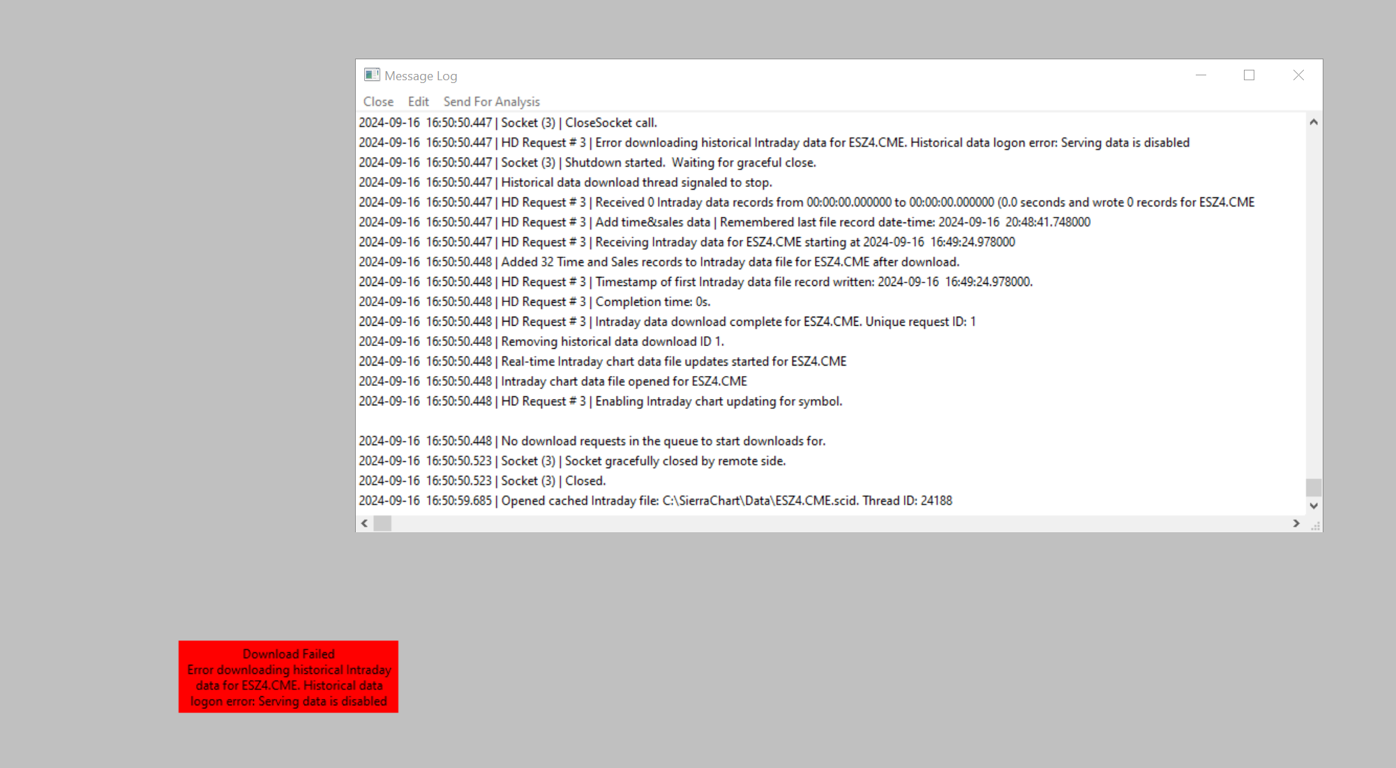 You have an entry for in the following setting: Sierra Chart Server Settings: CME Exchange Data Feed Historical Server Address Override (Global Settings >> Sierra Chart Server Settings >> General >> Special) Please remove that entry as it is no longer valid due to changes in our infrastructure. After you remove that, select "File >> Reconnect". You will be fine after that. For the most reliable, advanced, and zero cost futures order routing, use the Teton service: Sierra Chart Teton Futures Order Routing |