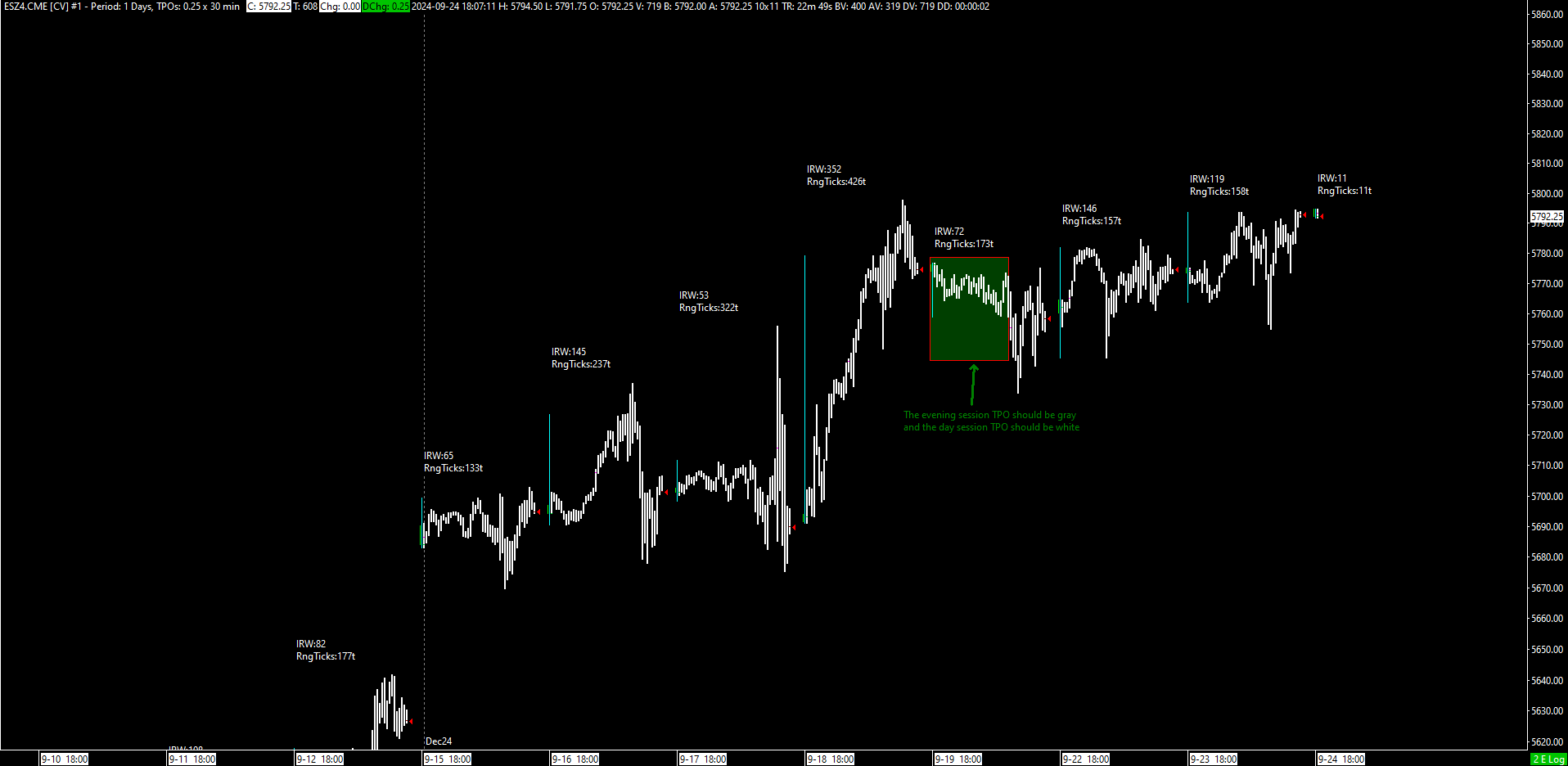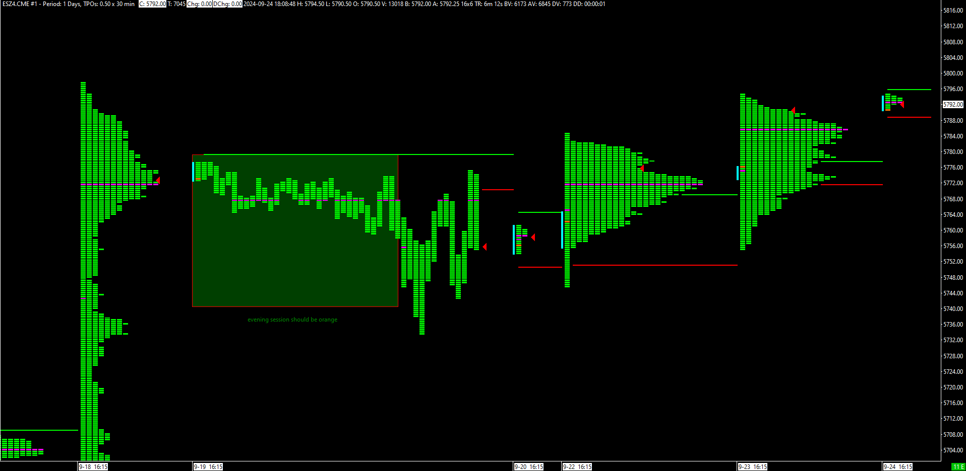 Hello, sorry to hijack this post. I'm having the same issue only after updating to this latest version. For a full and split session profile chartbooks, I use separate colors for day/evening blocks. Both were working fine before the update and without changing any settings they are only colored the day/evening session the primary color On the chartbook you provided on 9/18, if the setting "New period at day session start when using evening session" is set to "yes" it will combine the sessions and only color them green. This happens even with the "TPO letter/block colors" is set to "separate colors for day and evening sessions" |