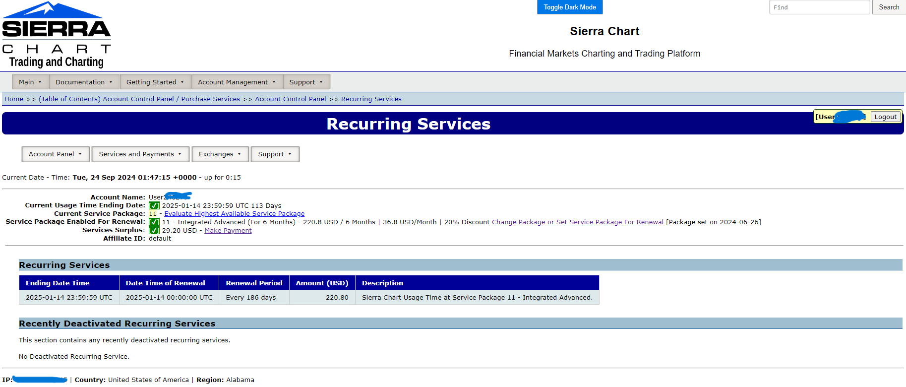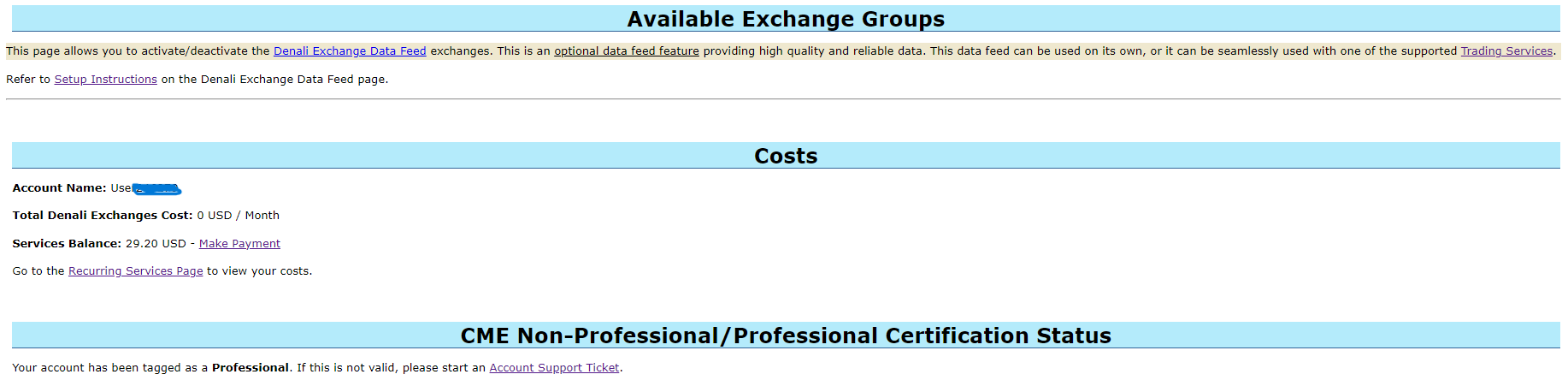 You are NOT currently setup to get any data from our Denali Exchange Data Feed. You were at one time, but since you did not fill out the exchange agreements properly you could not continue to be tagged as a Non-Professional and your status was changed, which also deactivated the exchange(s) that you had active. To get our Denali data again, you need to complete the agreements at the following link: https://www.sierrachart.com/UserControlPanel.php?page=ExchangeAgreements When filling out the "Uniform Subscriber Agreement", you need to enter the "Clearing Firm" (or brokerage name if you do not know your Clearing Firm) and "Account Number" for your live, funded, futures trading account. Refer to the following for more information on what is required to be a Non-Professional for the CME Group: Real-Time Exchange Data Feeds Available From Sierra Chart: Understanding and Accessing Data From the CME, CBOT, NYMEX, COMEX Exchanges After you take care of the agreements and they are accepted, then you can activate the Non-Professional exchange(s) at the following link: https://www.sierrachart.com/UserControlPanel.php?page=DenaliDataFeed#Exchanges -- In terms of limiting data due to using Rithmic data, the main thing is to NOT use a Continuous Futures Contract. Set the following option to "None": Chart Settings: Continuous Contract (Chart >> Chart Settings >> Symbol >> Symbol menu) For the most reliable, advanced, and zero cost futures order routing, use the Teton service: Sierra Chart Teton Futures Order Routing |