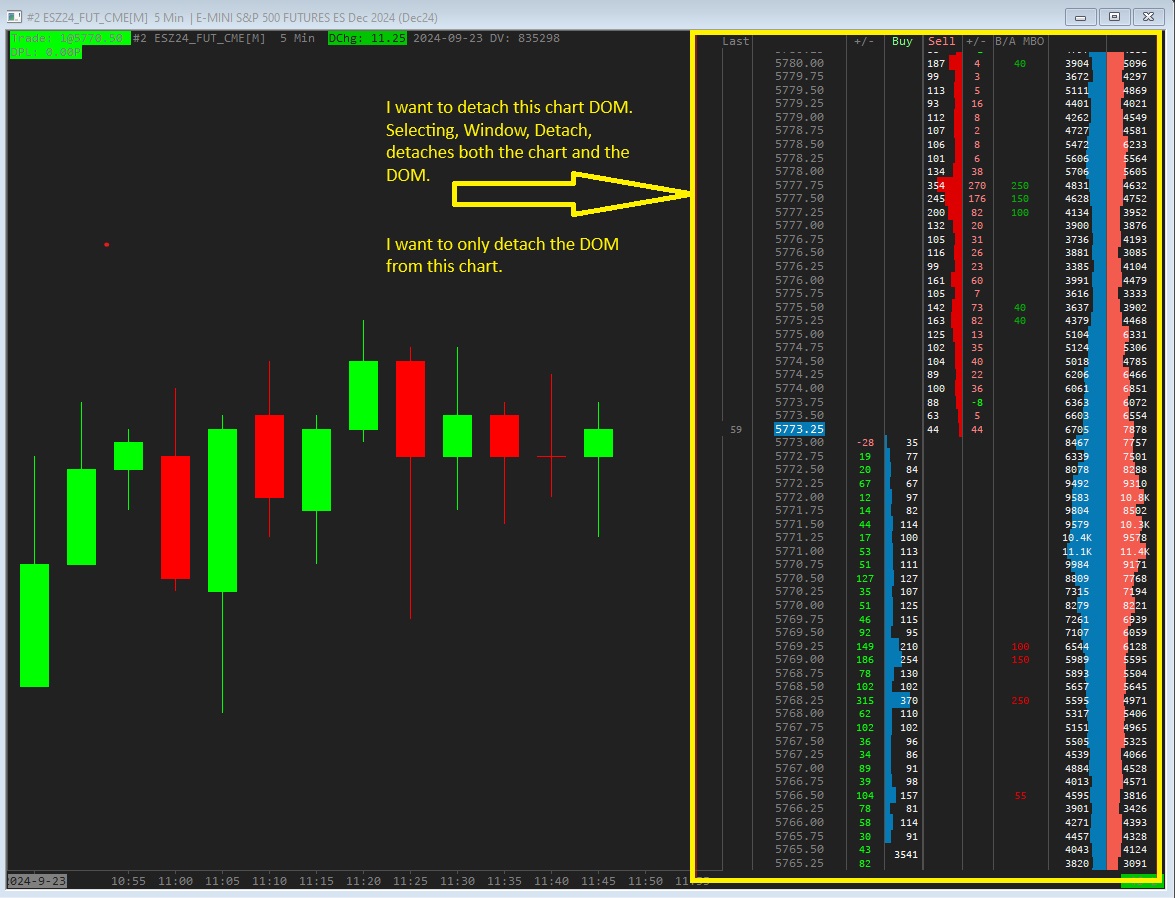 Support, Your suggestion did not work. Per my post, I want to detach my DoM from the chart and use the DoM as a stand alone DoM. The Window -> Detach method keeps the DoM attached tothe Chart which is not what I'm looking for. Please refer to the enclosed image. |