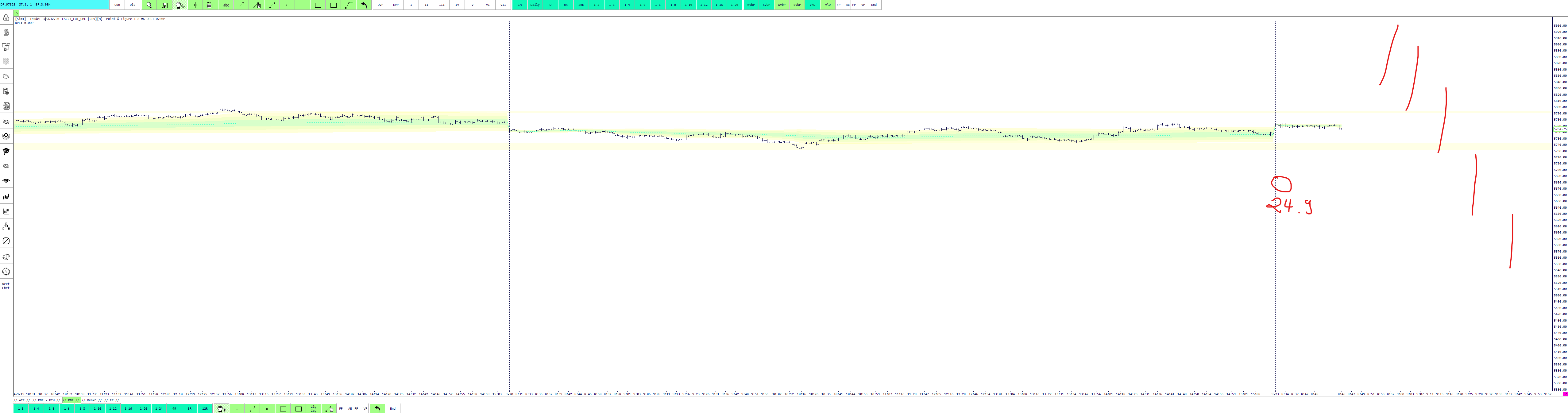 If you scroll the chart forward, does it fill in and show the current day's information? You changed the default settings for the "Scroll End Color" and "Scroll No End Color", so we are not sure what the indicator in the bottom right of the image is telling us (the pink 7). Is that pink color the End or Not End color? For the most reliable, advanced, and zero cost futures order routing, use the Teton service: Sierra Chart Teton Futures Order Routing |