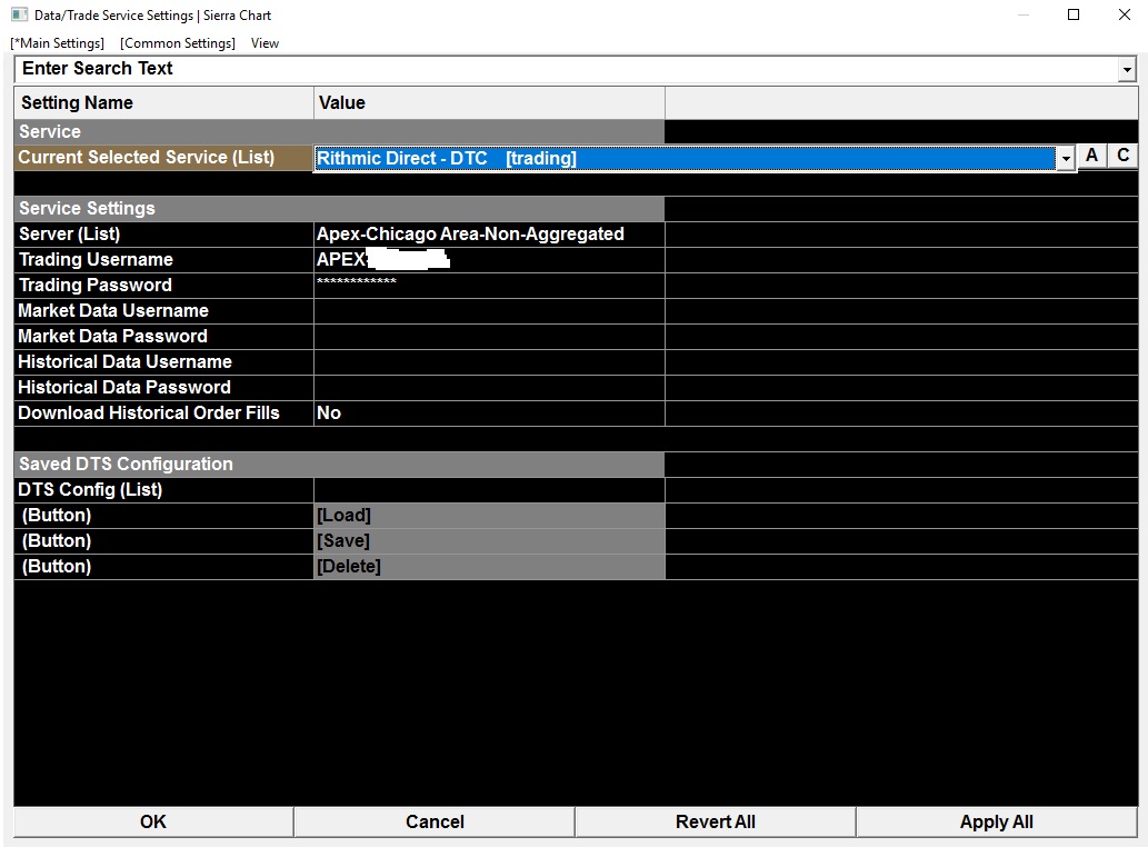 How do I use Denali Data, but actually execute trades with the Rithmic account? Refer to:Real-Time Exchange Data Feeds Available From Sierra Chart: Integration with Trading Services Yes: and skip Market Data Username/password and Historical Data Username/password (leave these 4 fields blank),