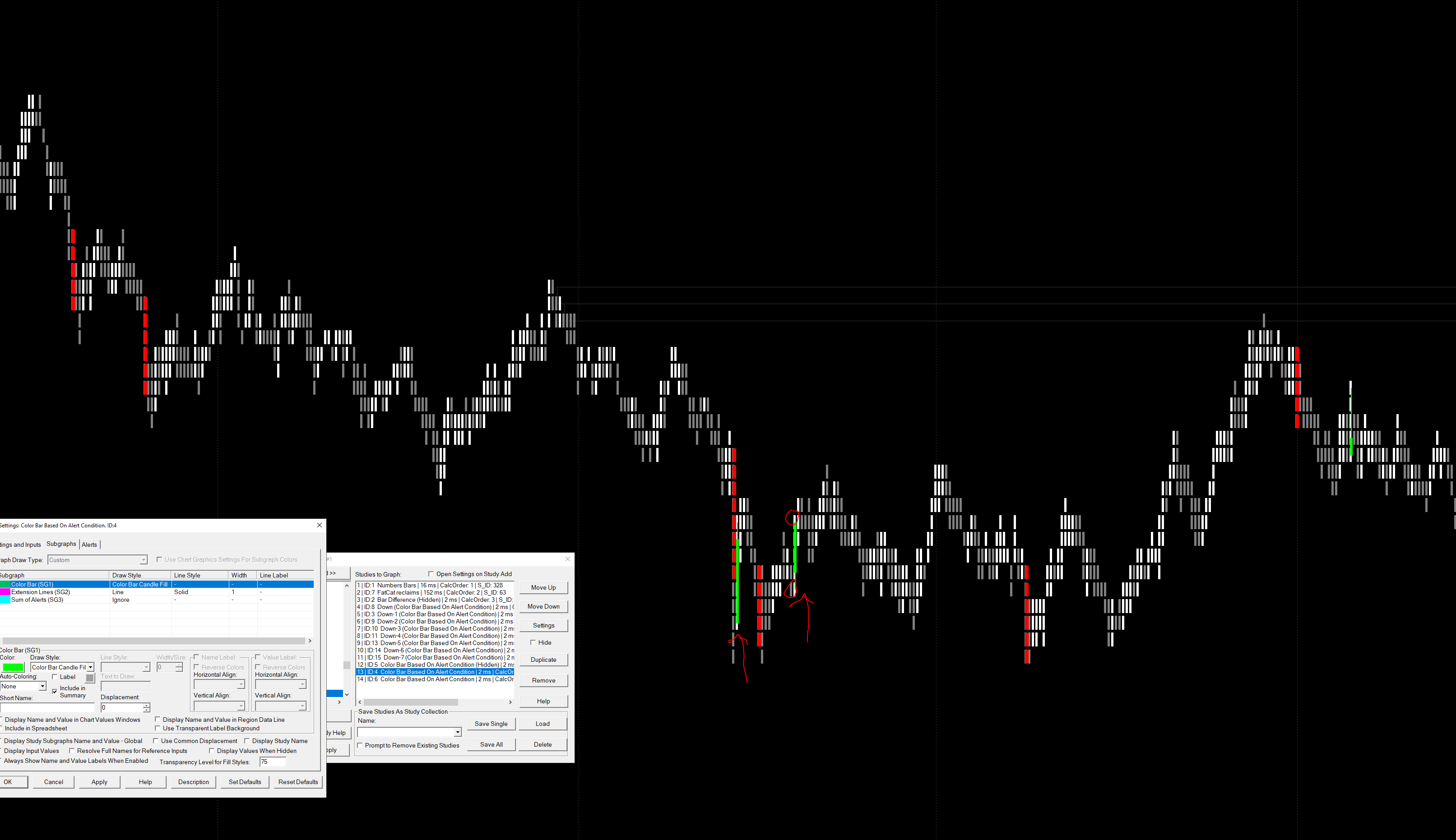 Hi, I have a unique situation I have not seen on forums. I'm using a 3 second chart that FatCat teaches to see micro structure. Most of the time in ES it doesn't move more than 2-3 ticks in this small time but sometimes it does and at certain areas can provide good trades such as after a big move down and later a 5 tick down move often END of move so I want to see this. Is there a way with color bar on alert condition to color the number bars areas? I don't want a candle because it doesn't completely cover the tick markets on numbers bars which tend to go up and down a few pixels MORE than the candle's do. For down bars I had to create multiple alerts to fill in each section and if I change scaling they will look messed up. Compare the red to green red looks so much better but sometimes price moves a lot and not every tick is filled using my method. Is there a drawing function that can cover up all numbers bars areas? I don't want to have to have 15+ sell alerts and 15+ buy alerts for something that really just needs a good drawing option to do it with just one. |