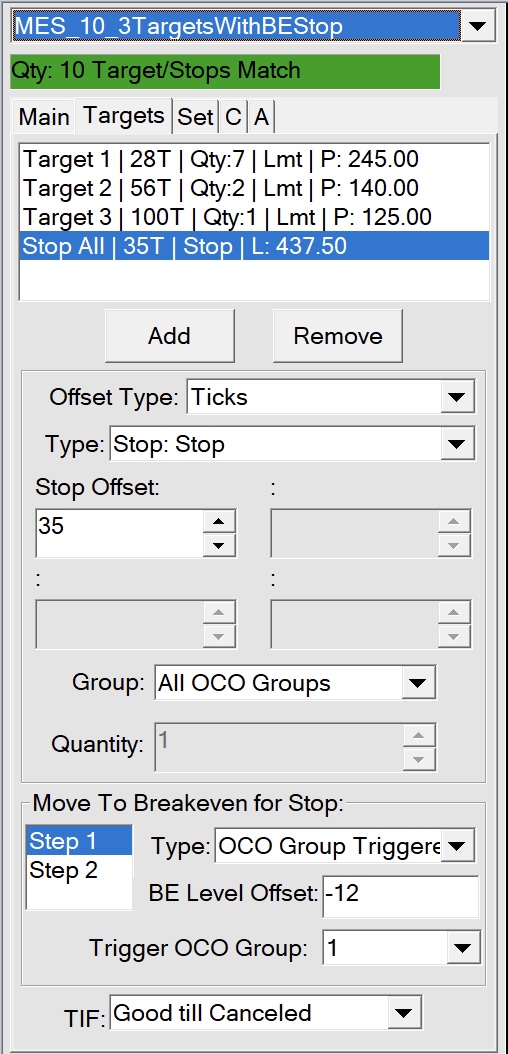 Hello, I trade with 3-target bracket orders, which include three limit orders and one stop. When the first limit order is filled, the stops move according to the offset rules set up (see attachment), and are adjusted for the updated open contract quantity. However, the original stop order does not go away. So I'm left with two stop orders... one with the adjusted contract quantity, and one with the quantity of contracts that were just closed via Target 1 limit order. If I then cancel the unneeded stop order, all pending orders cancel. This does not happen in the Sierra Sim, only when trading the "live" account (which is a prop trader eval). Configuration details are in the second attachment. Any ideas? Thanks, Nate |