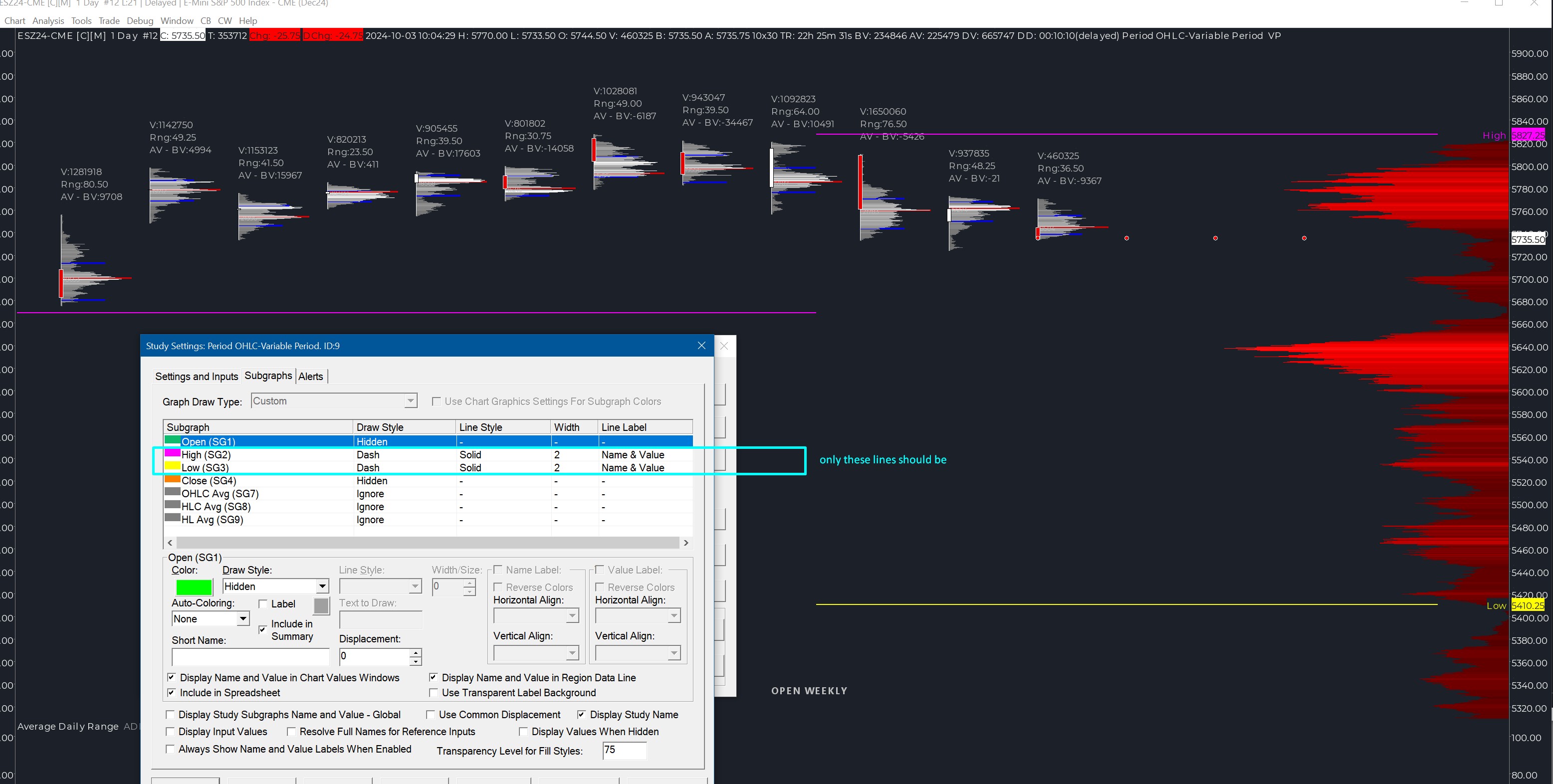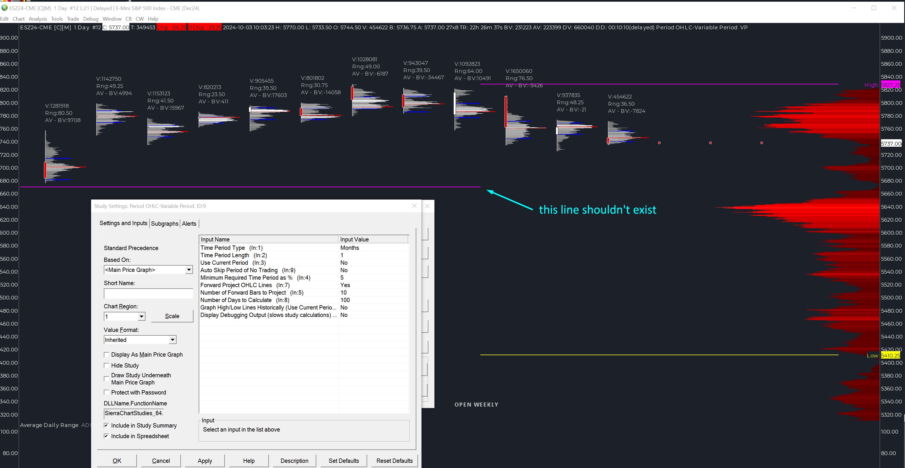 Hi, I've a problem with this study because, when I try to set it for having previous month high/low, a third line show up on the chart like in my screenshots attached. The problem is only for previous months, while week and previous week works fine (now I hide that study to make more easy see the problem). - Intraday data - days loaded in the chart: 70 I tried to re download and recalculate but nothing, I don't understand whats' wrong..thank you |
