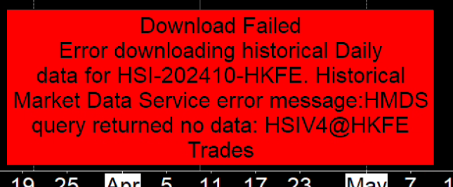 when trying to open an HSI-202411-HKFE daily chart, i get the attached error message Download Failed Error Downloading historical Daily data for HSI-202411-HKFE. Error user is not authorized to execute query for one or more of the specified symbols i have market data subscribed and minute data works just fine. please advice |
