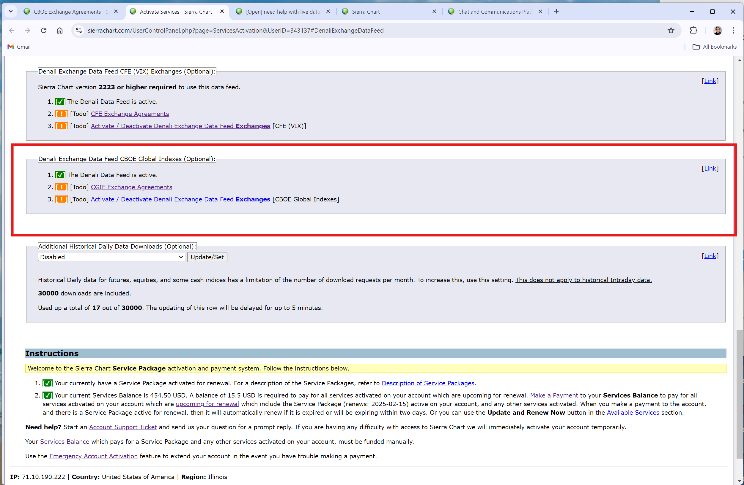 The section for the "CBOE Global Indices" is towards the bottom of the page at the following link: https://www.sierrachart.com/UserControlPanel.php?page=ServicesActivation#DenaliExchangeDataFeed The attached image shows where it is located relative to the bottom of the page (scroll all the way down to the bottom to find it): For the most reliable, advanced, and zero cost futures order routing, use the Teton service: Sierra Chart Teton Futures Order Routing |
