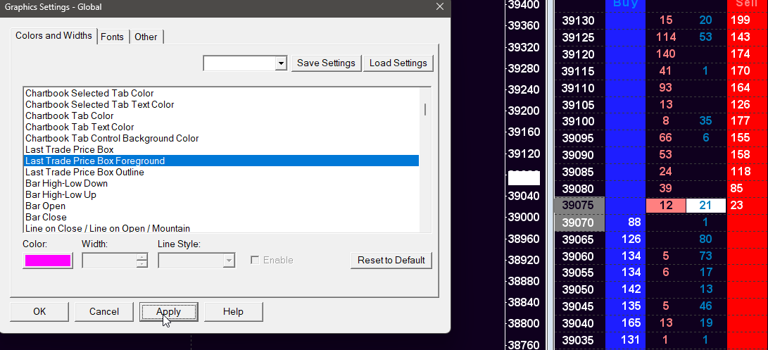 I tried hot pink. See attached. Last Trade Price Box Foreground is still white. The problem started after I was editing the similar setting for the Trade DOM, which you can see in the same image. I never edited the value for Last Trade Price Box Foreground. |