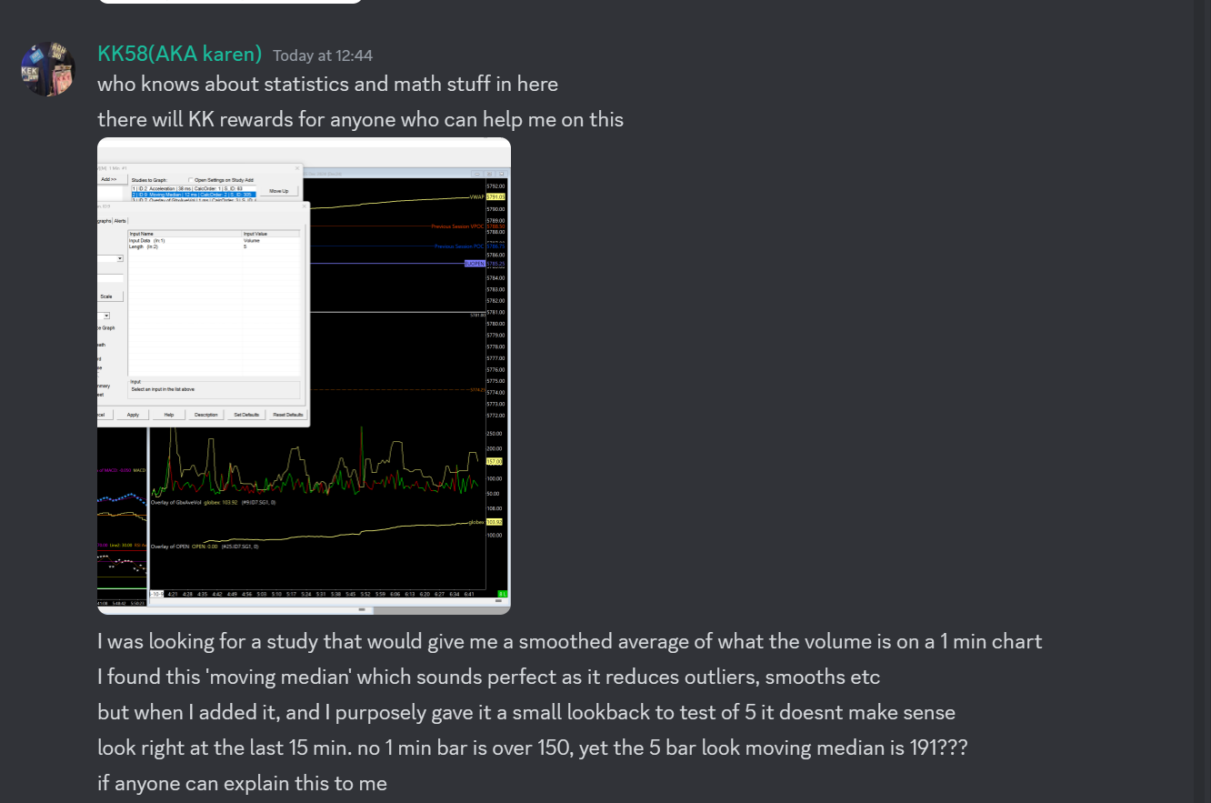 John, I hope you can help explain what I am seeing in the chart attached. I posted this in Jay Strizz discord room and even the quant Poppa couldn't figure it out. In the attached screenshot you will see 1 min ES chart, with volume plotted as a line. You can see I have a very short lookback(so I can see how accurate it was), but the moving median in yellow makes no sense. How can it be higher than the highest volume level in the 5-bar lookback? I hope you see I don't ask stupid questions anymore, I tried to ask other people, but they didn't understand it either. Thank you John for your time. |