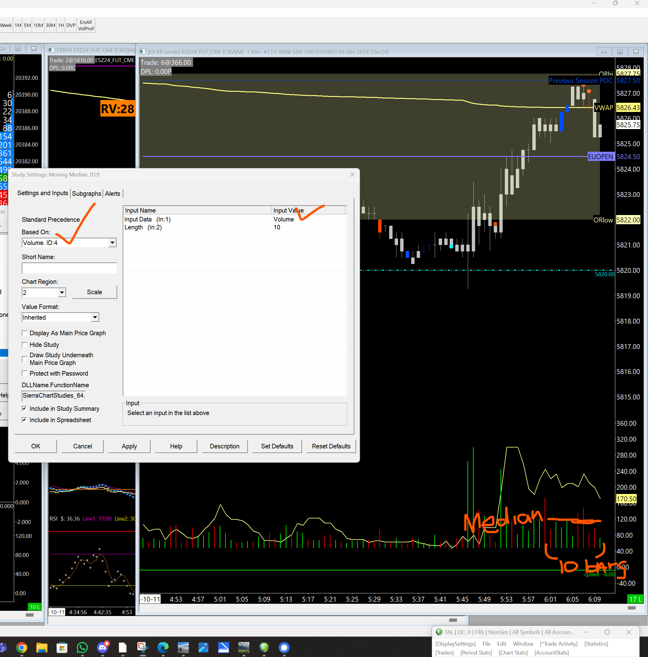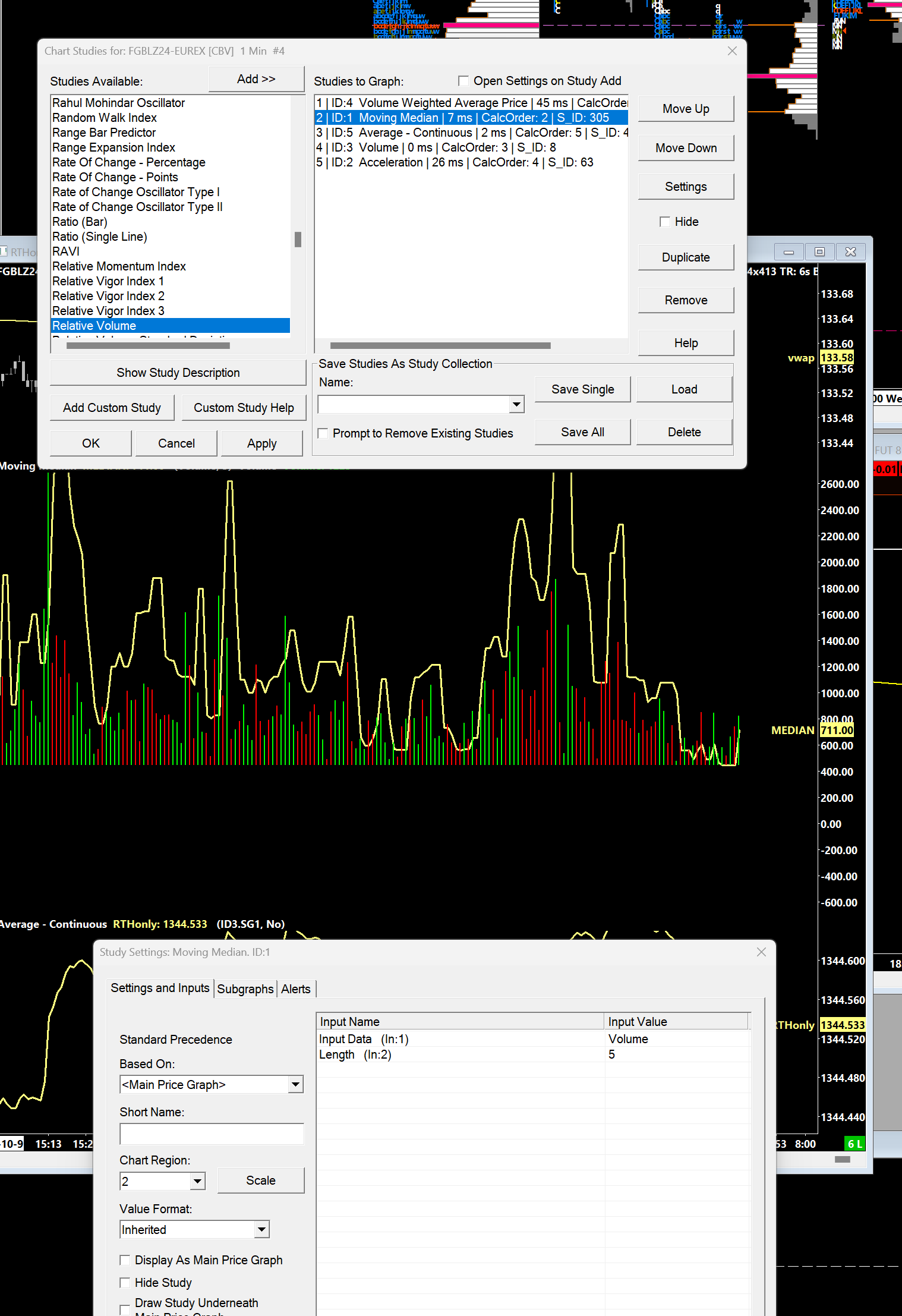 Hi John, Rats this still seems like it is not working. Look at screenshot please. I have lookback set for 10 bars/mins on this 1 min chart. You see there is no bar in that time anywhere near what moving median is plotting. I have the study set to look at volume. What am doing wrong? Just to confirm, this study should show me the median(the value in the middle of the 10 bars), so how can the study show a value higher than any of the bars... Sorry to bother you, but I still must have something off on settings. Or I don't understand what a median is haha Karen |