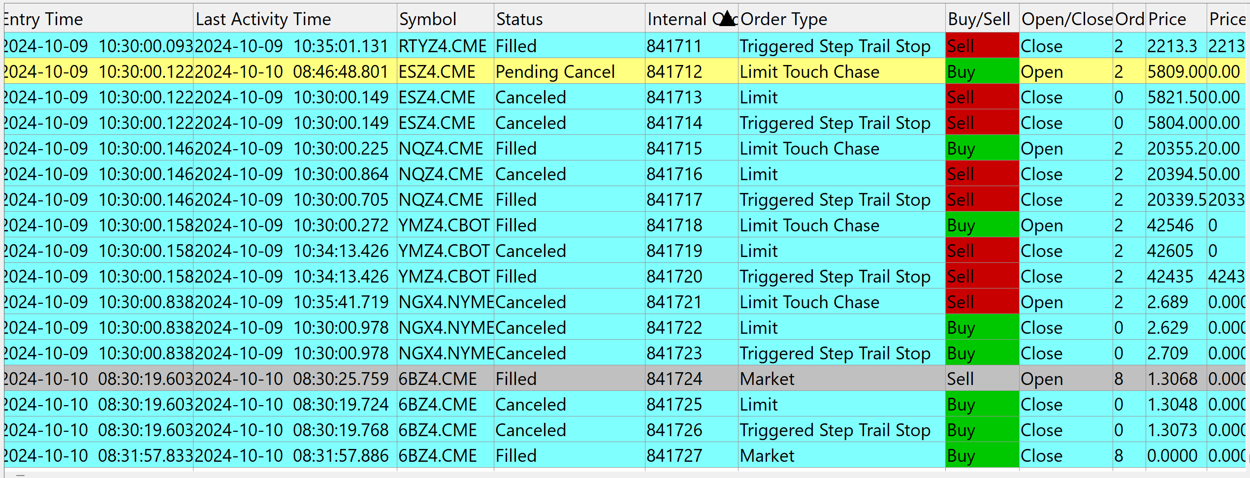 With reference to the pending order, it was a parent order to enter a position. If the position isn't filled within a specified amount of time then it should cancel the OCO but it shouldn't take days to cancel an order. I think there's an issue with Rithmic processing OCO orders from Sierra. I'm monitoring positions currently and had a position where the trail was in profit as the position was significantly onside. The market came back and hit my trail, and Rithmic OMS is recording it as a loss as if the stop was never trailed. It's as if a stop is being sent and never moving. Mind you before my trail is triggered, my stop moves to BE so being onside several points I had at been at breakeven the majority of the trade. Will update momentarily |