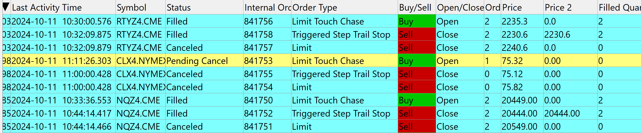 You need to look at the "OrderActionSource" on the Trade Activity tab for those orders and see what it states on why those orders were cancelled. As to the "Pending Cancel" order, that means that Rithmic never responded to closing out that order. If that particular order was just cancelling due to the opposing order having filled, then that will not have any impact on your Profit/Loss and you can either ignore it or delete it. For the most reliable, advanced, and zero cost futures order routing, use the Teton service: Sierra Chart Teton Futures Order Routing |