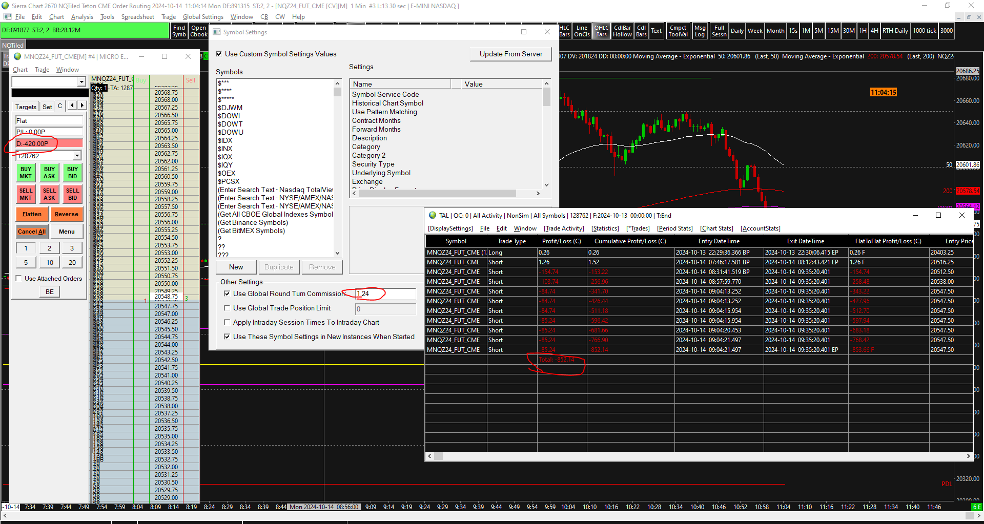 Hello, Please refer to the attached image. This is using Teton data feed and keep the commissions for MNQ at $1.24 which is 20 cents higher than actual. It should not matter much as the contracts traded were 9 mnq. The DOM kept showing incorrect P/L information and I did not realize that it was incorrect until my account got liquidated. Where is the issue and how to fix this. My actual loss was twice as much as the one shown on the DOM. Regards, |