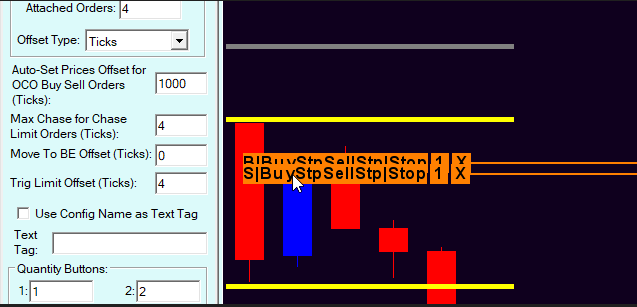 Please see image. Unless I am confused, this doesn't appear to be functioning as I expected. To prove the point I set the value of 1000. But on screen, the potential orders are not 1000 ticks apart, they are a few ticks. EDIT: resolved: you need to use the "OCO Buy Stop Sell Stop (Auto-Set)" order type. I was using the order type without Auto-Set in the chart trade menu. If it is ok I will leave this post in case it helps others searching for the same thing. Order Types: OCO Buy Stop Sell Stop The Sierra Chart Chart Trading feature also provides an OCO Buy Stop Sell Stop Auto Set command. To use this, it is first necessary to determine the offset for the orders, in Ticks, from the center price that you select on the chart. Go to the Set tab on the Trade Window of the chart and set the Auto-Set Prices Offset for OCO Buy Sell Orders to the number of Ticks that you want to offset the orders from the center price by. Once this is set, it does not need to be set again. It is saved with your Chartbook.