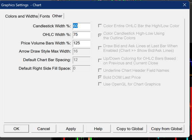 There are two different sets of graphics settings - Global and Chart. Refer to the following: Graphics Settings: Using Different Color and Graphics Settings for Specific Charts You are in the Chart specific graphics settings and those options are only available to be set in the Global graphics settings. This is why they are greyed out. Select "Global Settings >> Graphics Settings" to change those options. For the most reliable, advanced, and zero cost futures order routing, use the Teton service: Sierra Chart Teton Futures Order Routing |