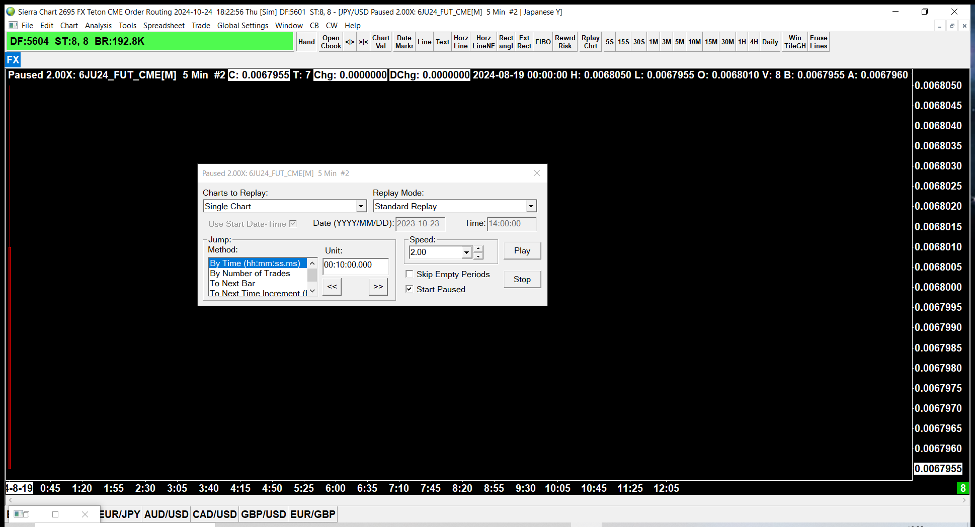 This absolutely is a "Days to Load" issue. You are trying to start the replay based on a set date and time, which is set to 2023-10-23 at 14:00:00, but you do not have data loaded that far back. The earliest date in your chart is 2024-08-19. You need to have the data loaded going back as far as you are wanting to start the replay. For the most reliable, advanced, and zero cost futures order routing, use the Teton service: Sierra Chart Teton Futures Order Routing |